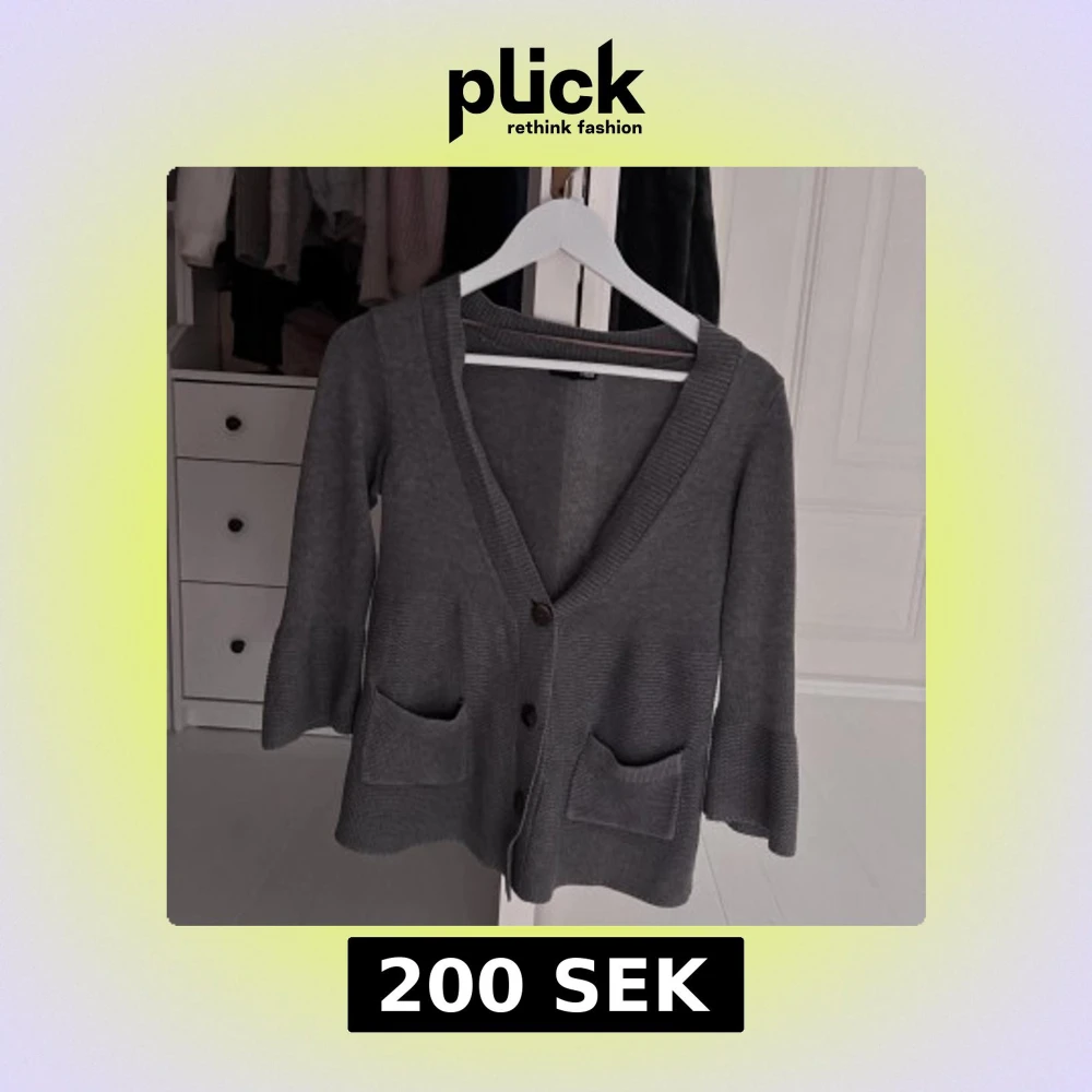 Mysig grå kofta från H&M med trekvartsärmar, djup v-ringning och knappar framtill. Koftan har två praktiska fickor och är stickad i mjukt material. Perfekt att slänga över en t-shirt eller linne för en chill look.