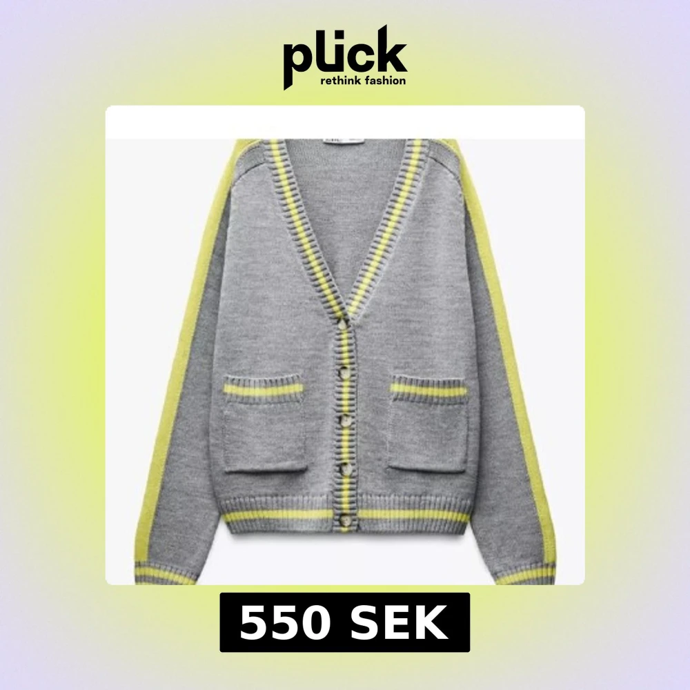 Grå kofta med ljusgula ränder längs ärmar, muddar och knappslå. V-ringad med ribbade detaljer och stora knappar framtill. Två fickor fram med gul rand. Stickad i mjukt material, perfekt för lager-på-lager och chill stil.