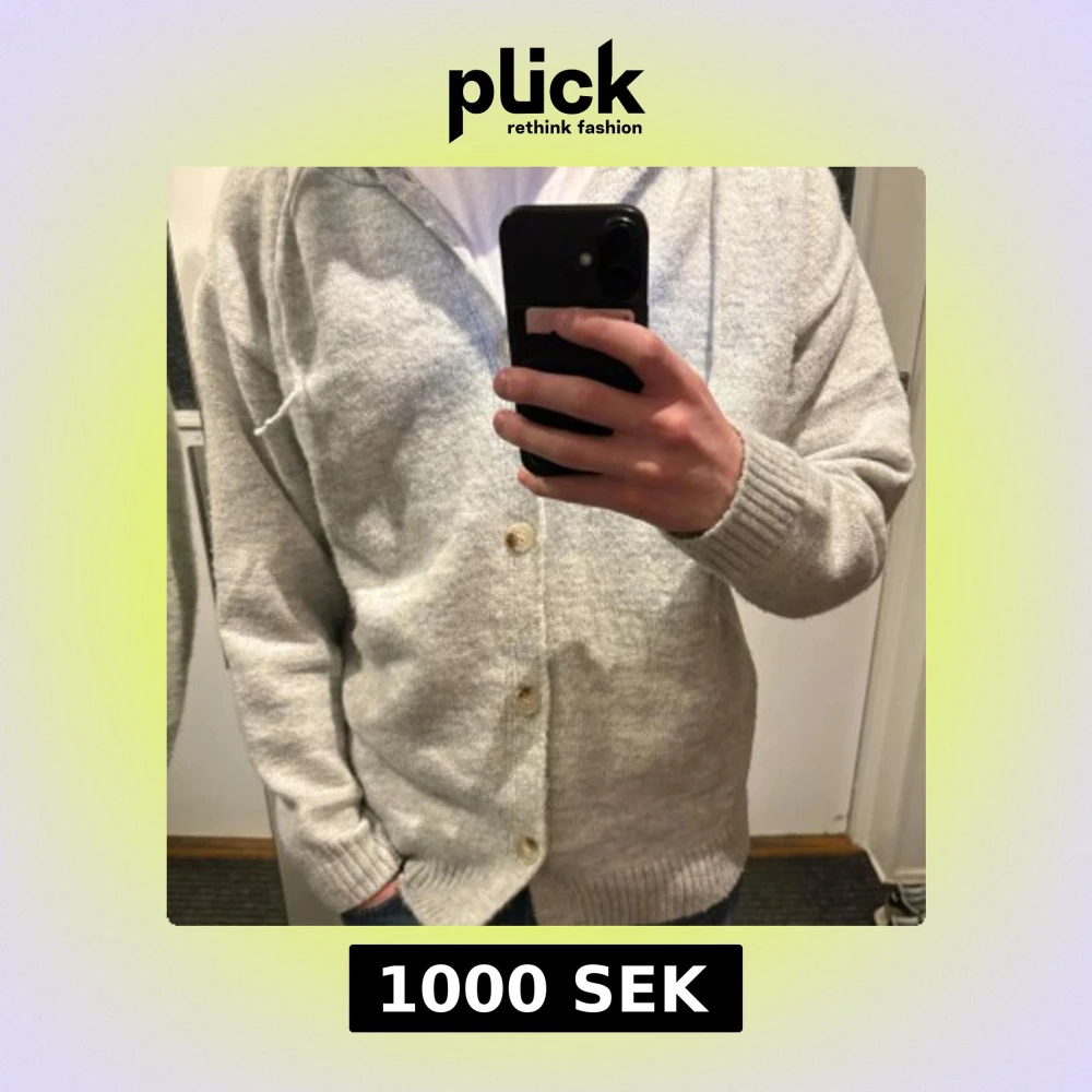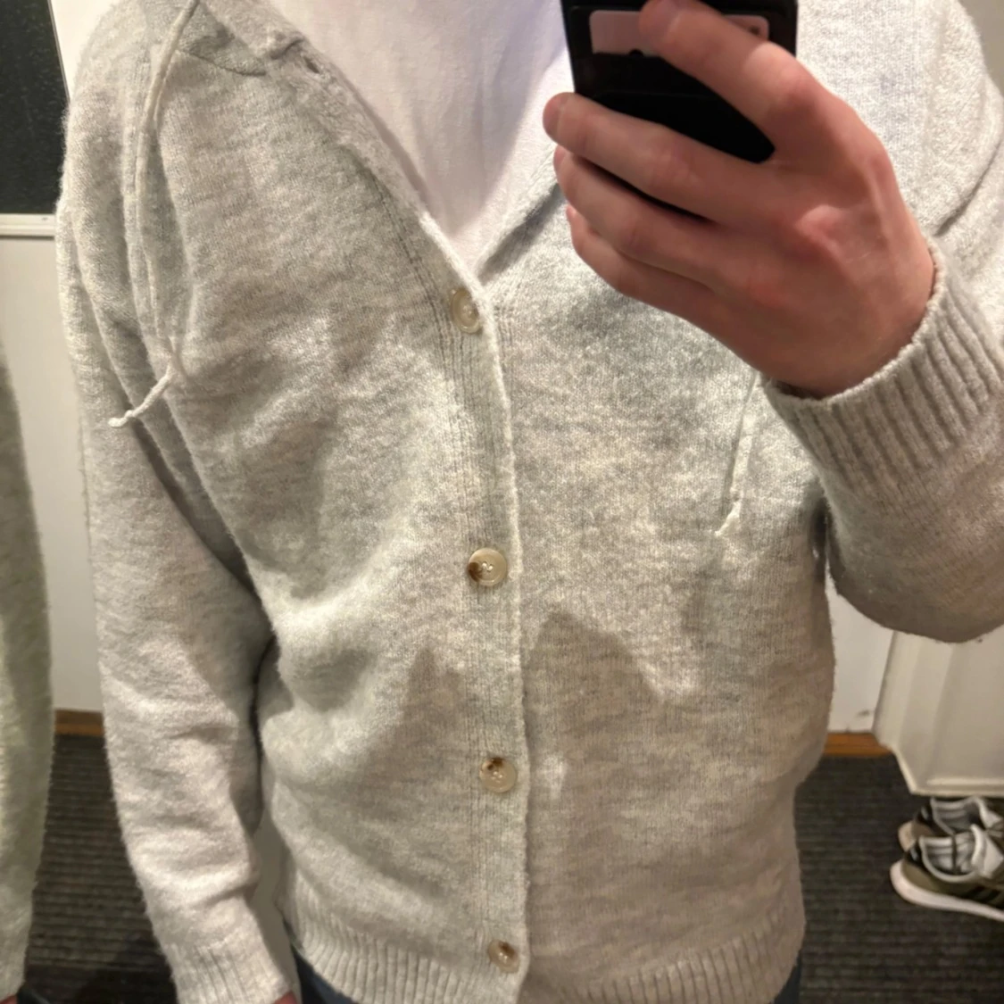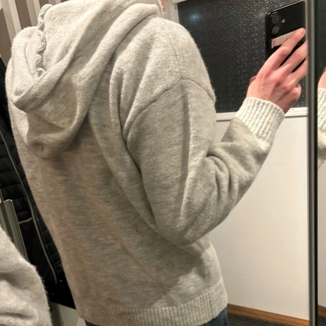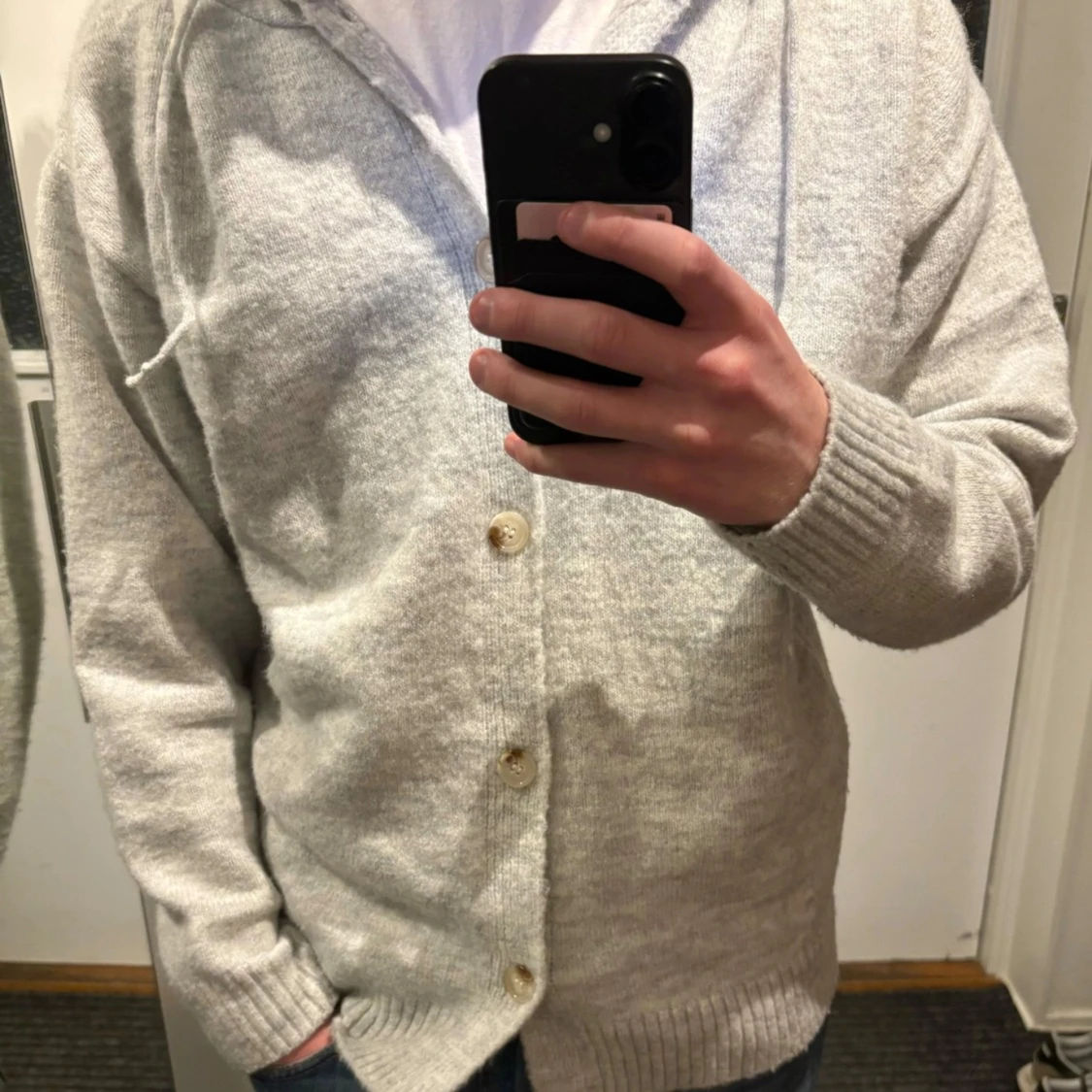 Säljer en skön grå kofta med huva och knappar framtill. Perfekt för kyliga dagar. Koftan har långa ärmar och ribbade muddar vid ärmslut och nederkant.