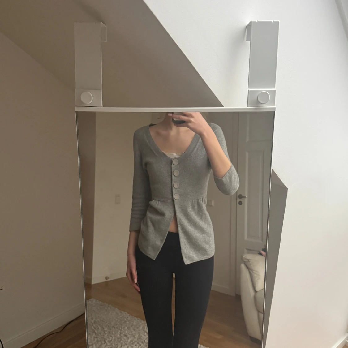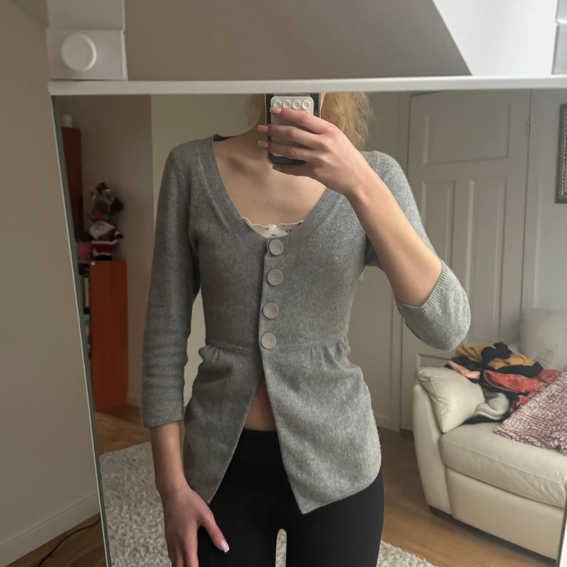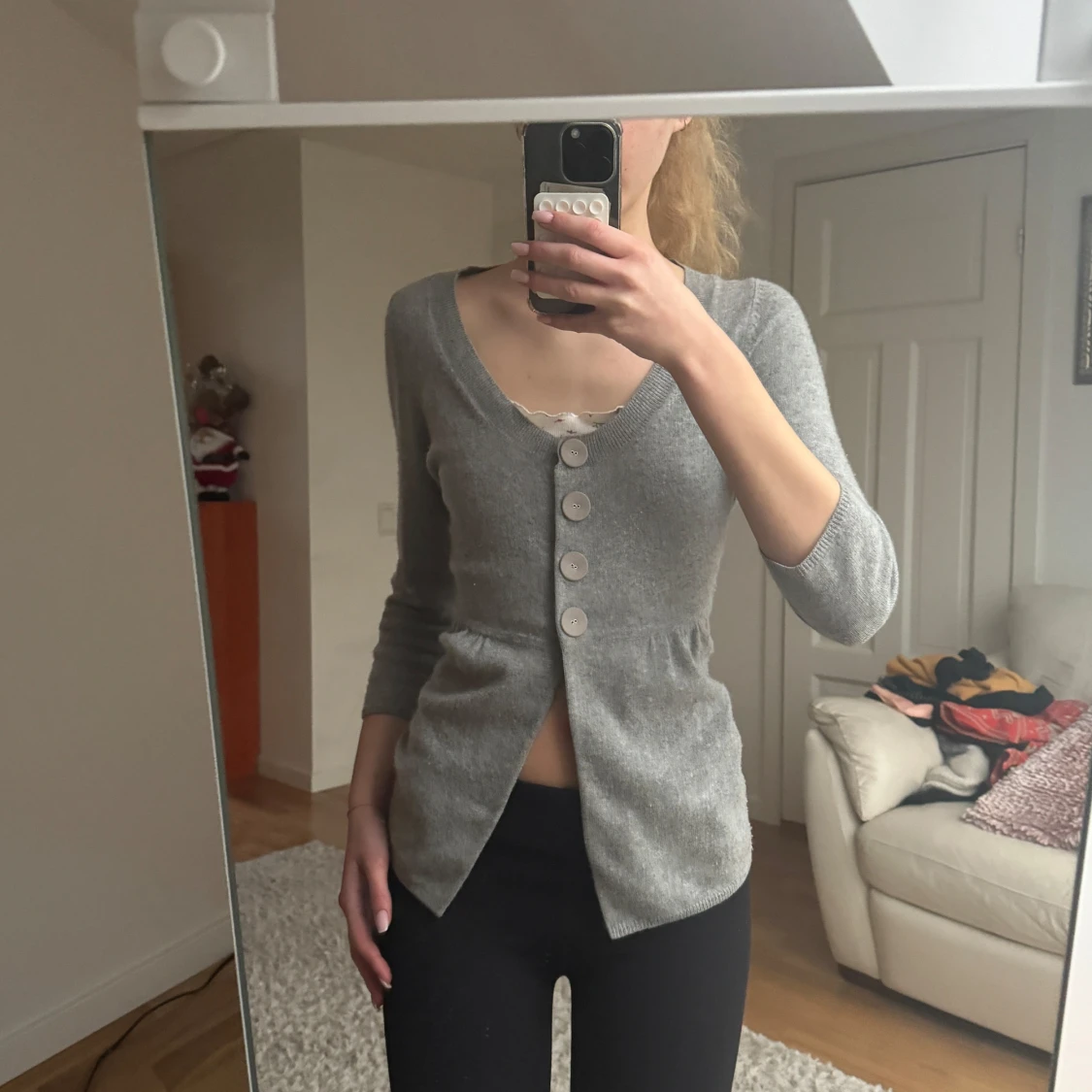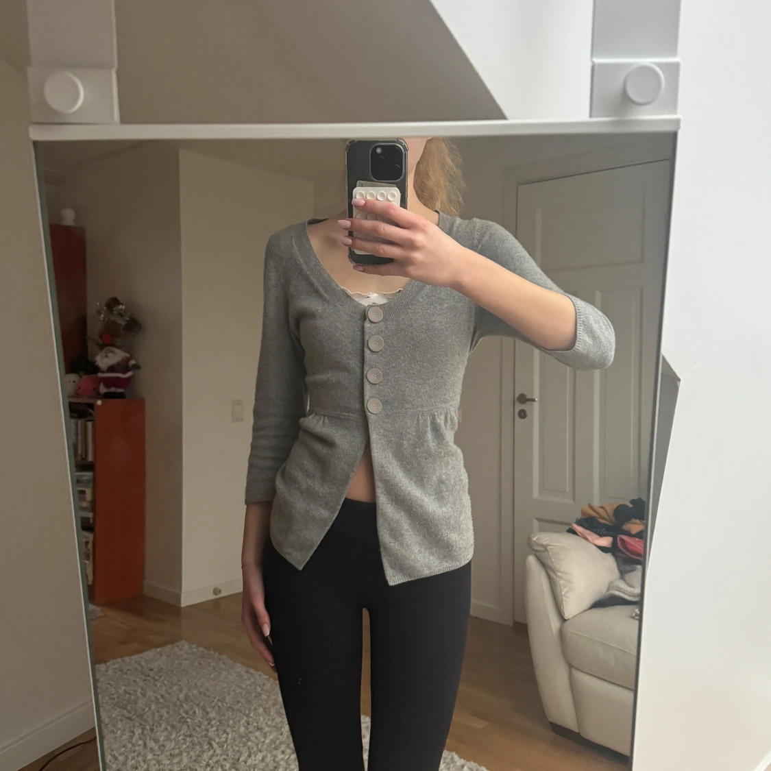 Snygg grå kofta med trekvartsärm och stora knappar framtill. Den har en figurnära passform och är perfekt för lager-på-lager-stil. Koftan är i ett mjukt material som ger en bekväm känsla.