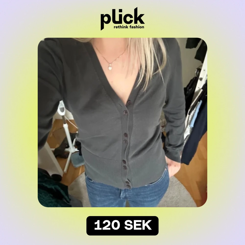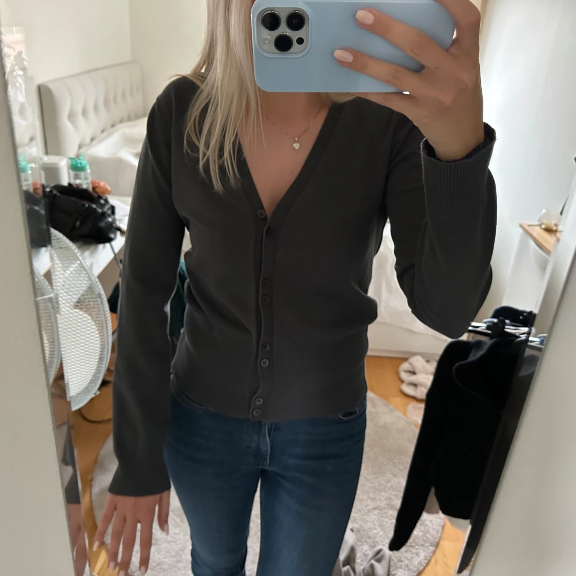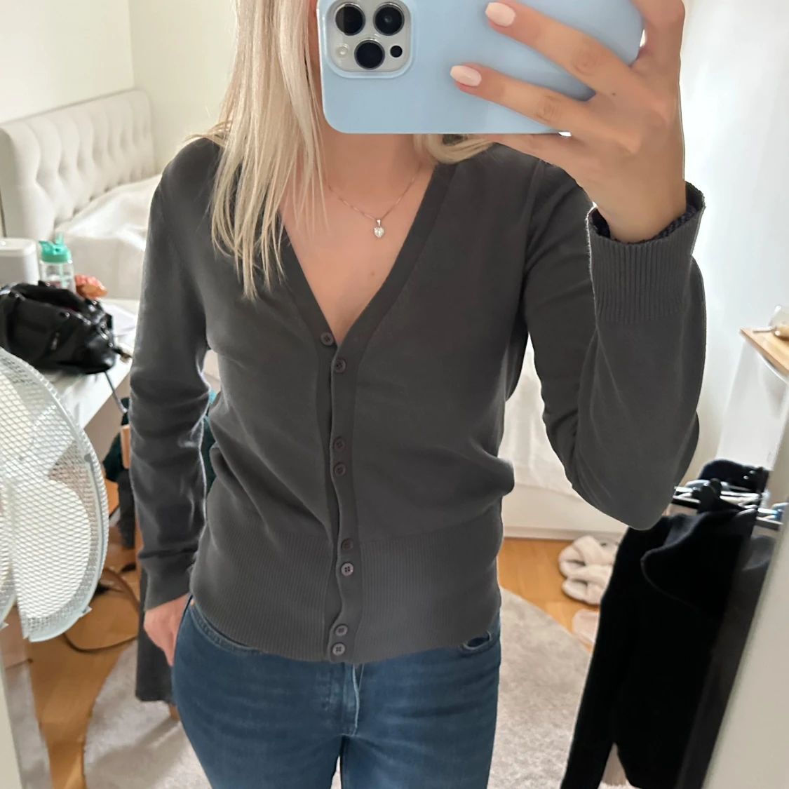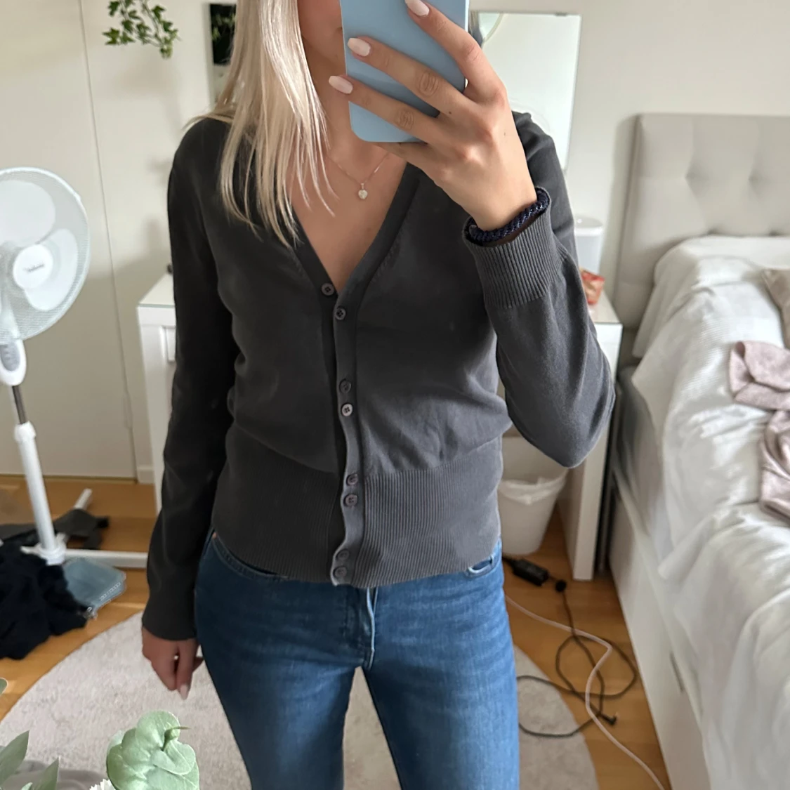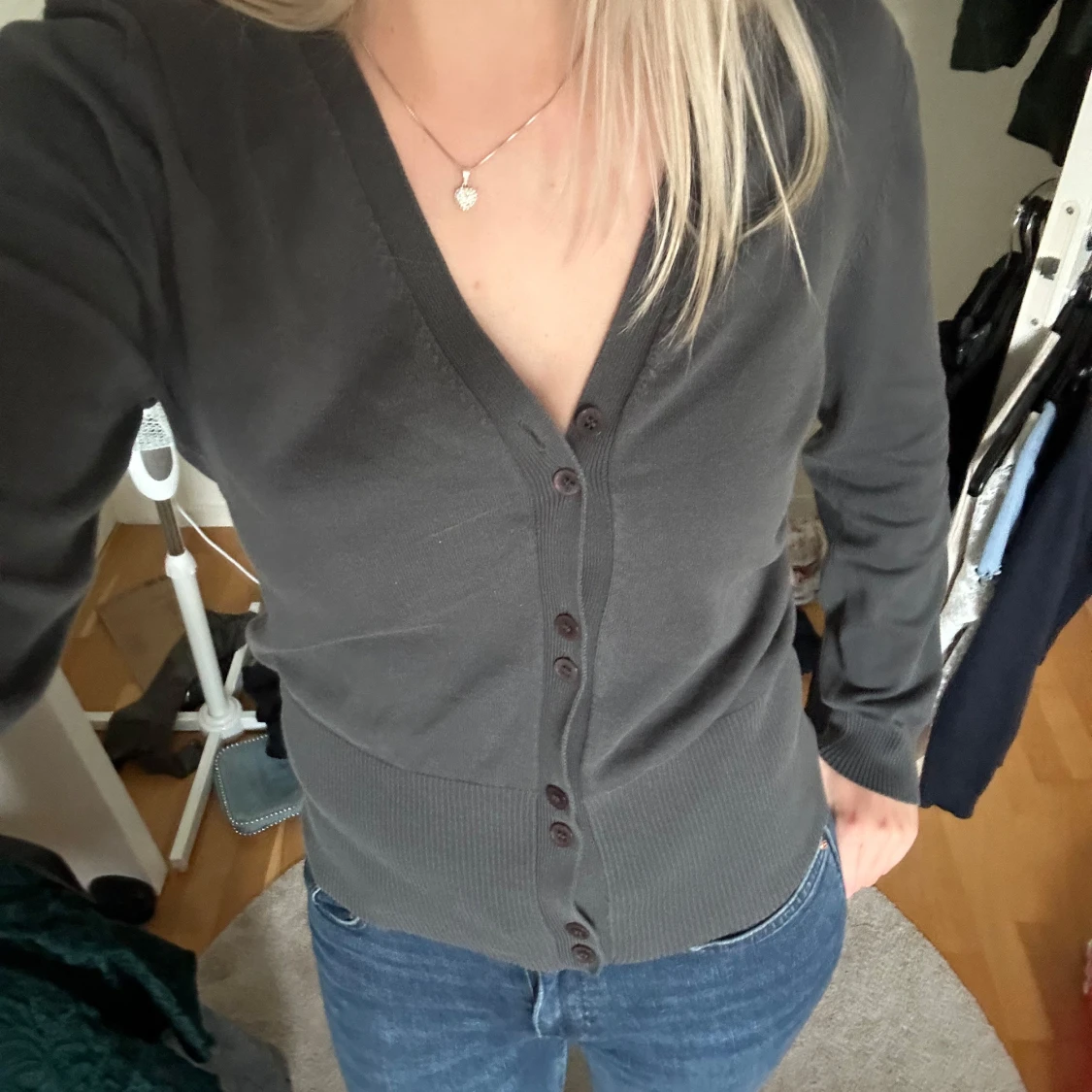 Säljer en stilren och bekväm grå kofta med knappar framtill. Den har en v-ringad design och långa ärmar, perfekt för både vardag och lite kyligare dagar. Koftan är i bra skick och passar till det mesta i garderoben. Perfekt för höst och vår!