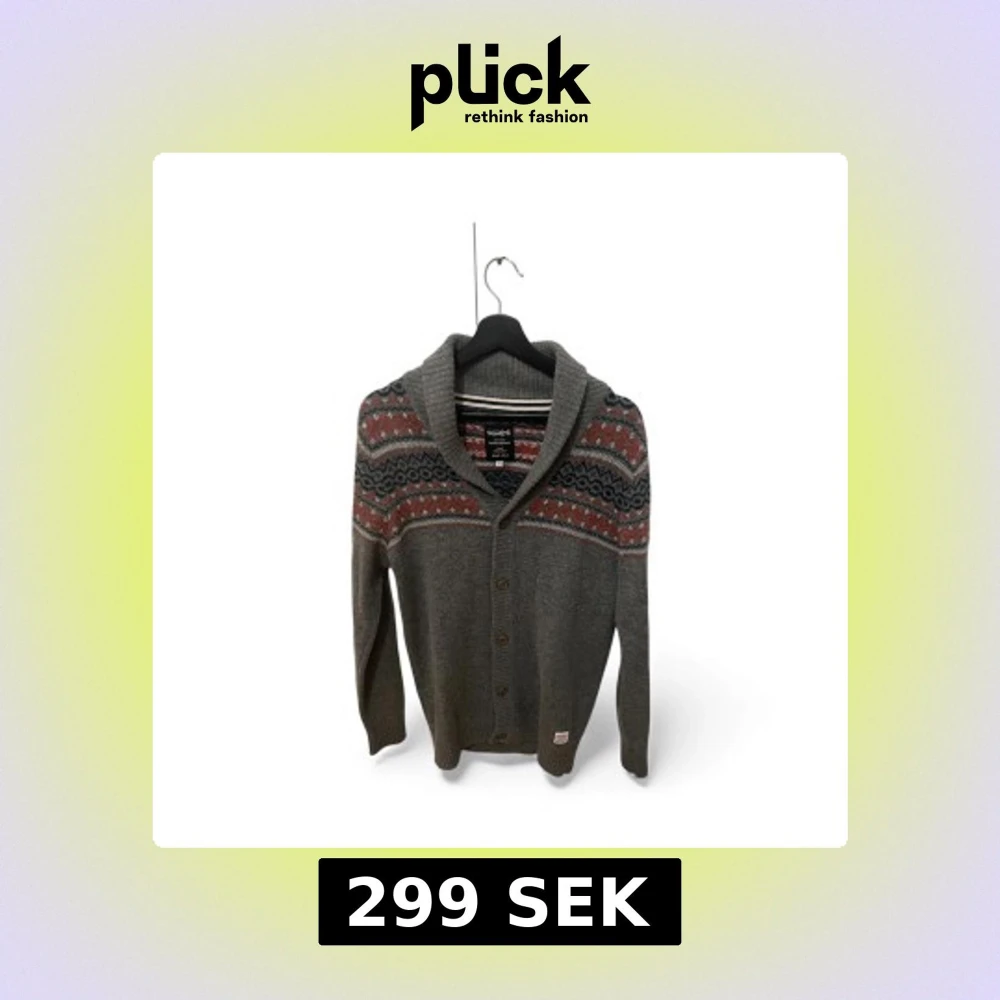 Kofta i grått med snyggt mönster i rött, vitt och mörkblått över axlar och bröst. Tröjan har bred krage, knappar framtill och ribbade muddar. Perfekt för dig som gillar vintage-vibe och vill ha något som sticker ut.