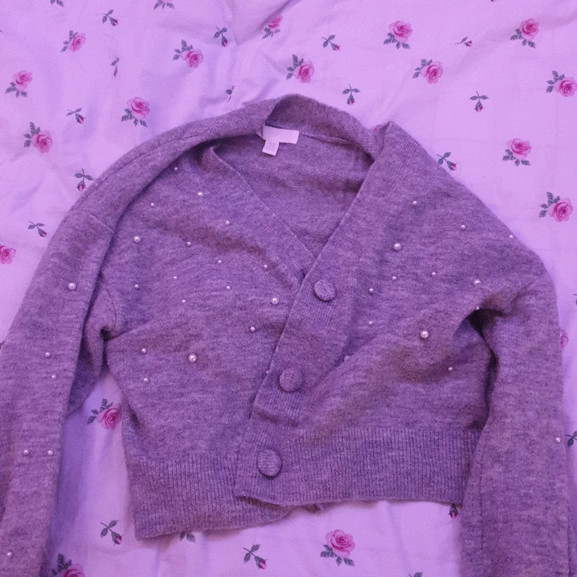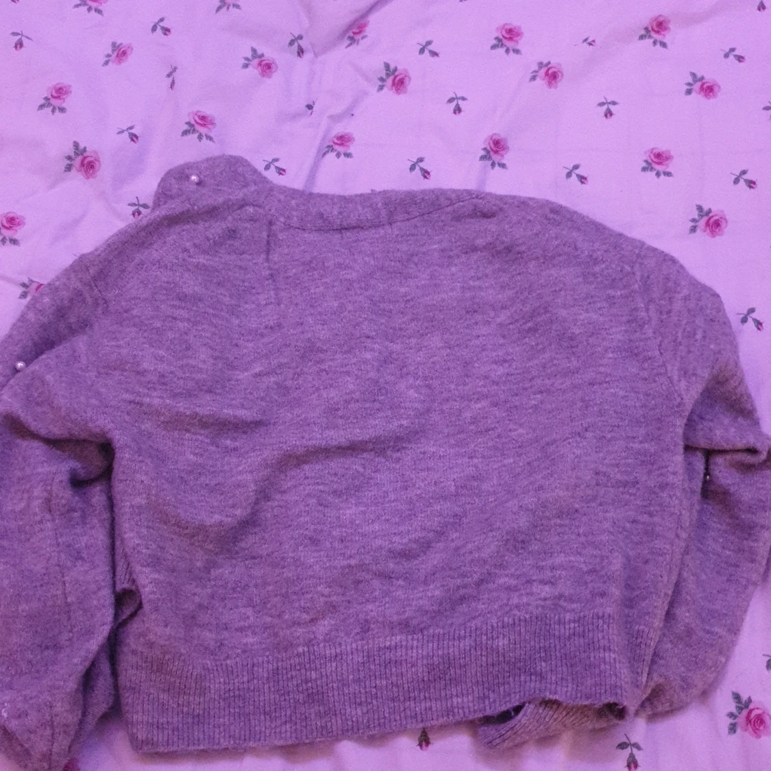 Säljer en söt grå kofta med pärldetaljer. Koftan är croppad och har stora knappar framtill. Perfekt för att lägga till en touch av elegans till din outfit. Passar bra till både jeans och kjol.
