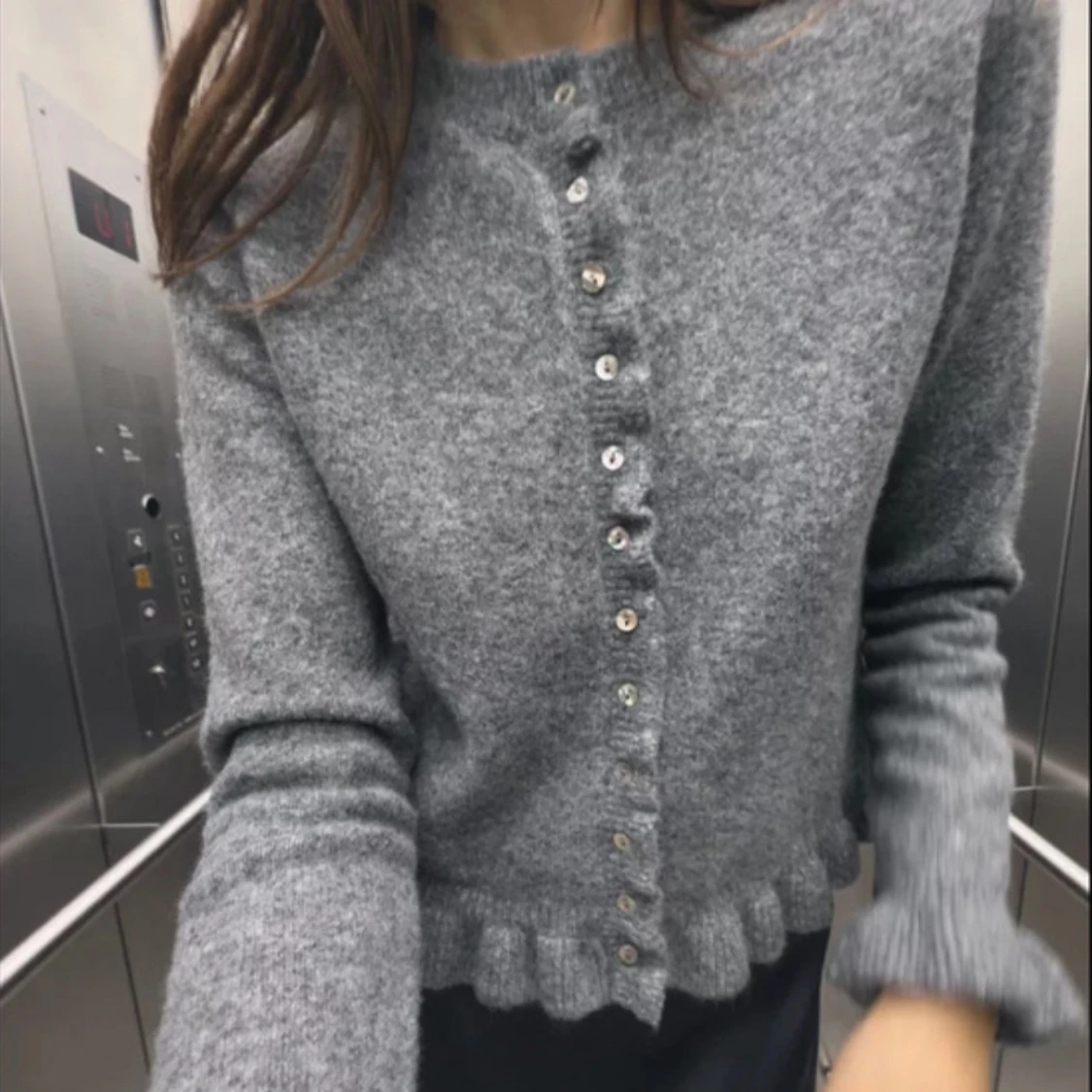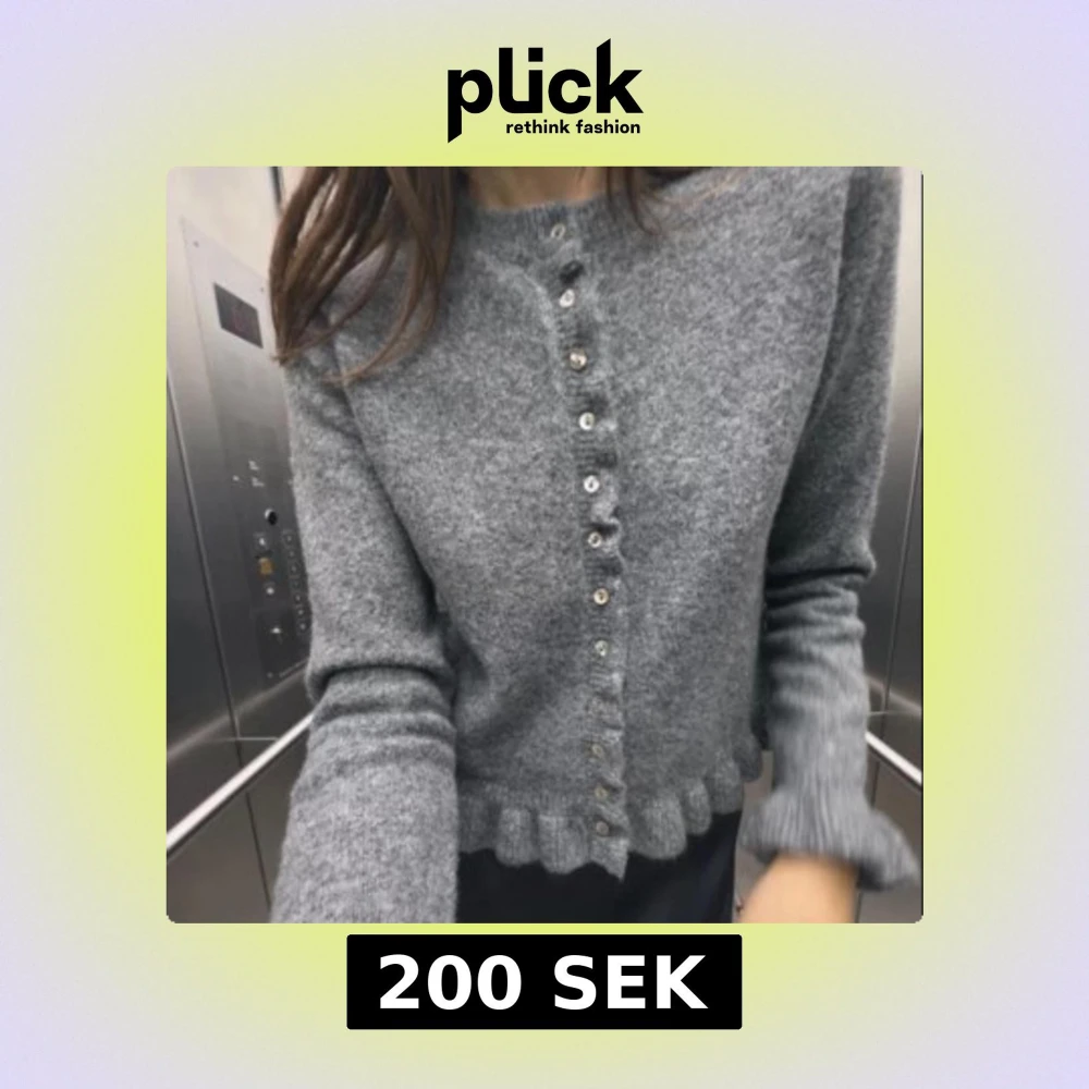 Superfin grå kofta i mjukt stickat material med volangkant nertill och längs ärmsluten. Stängs med små knappar framtill och har en klassisk rund halsringning. Perfekt att slänga över en topp för en chill look.