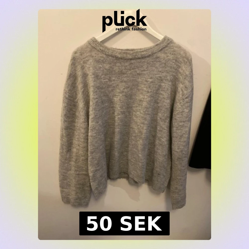 Mysig grå stickad tröja med rund halsringning och långa ärmar. Perfekt för kyliga dagar och enkel att matcha med jeans eller kjol. Tröjan har en avslappnad passform och ribbade muddar vid ärmslut och hals.