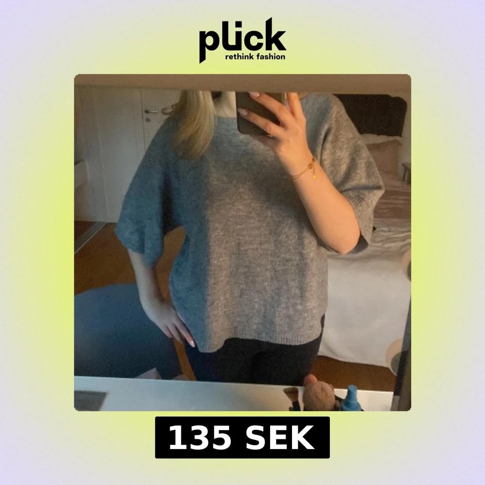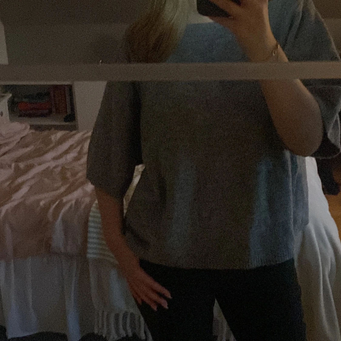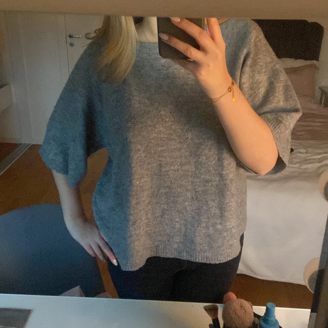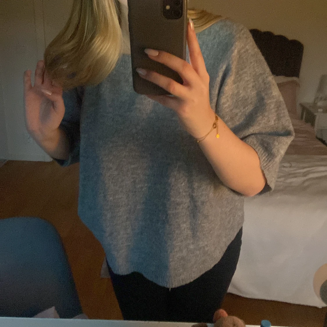 Säljer en mysig grå stickad tröja med trekvartsärmar. Perfekt för kyligare dagar och enkel att matcha med olika outfits. 🩶