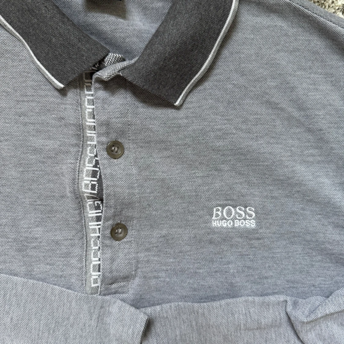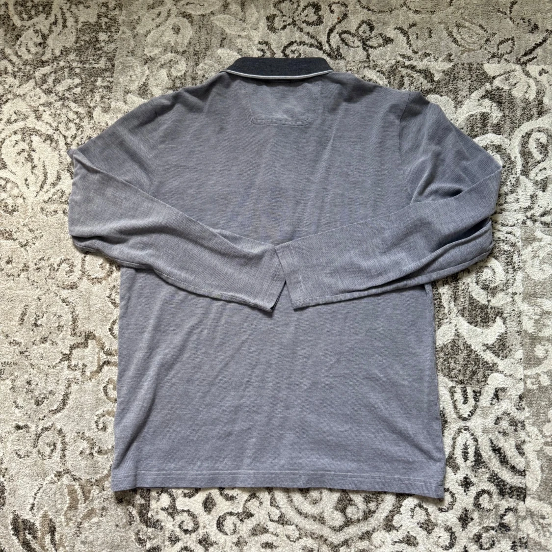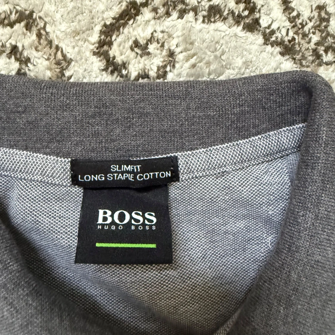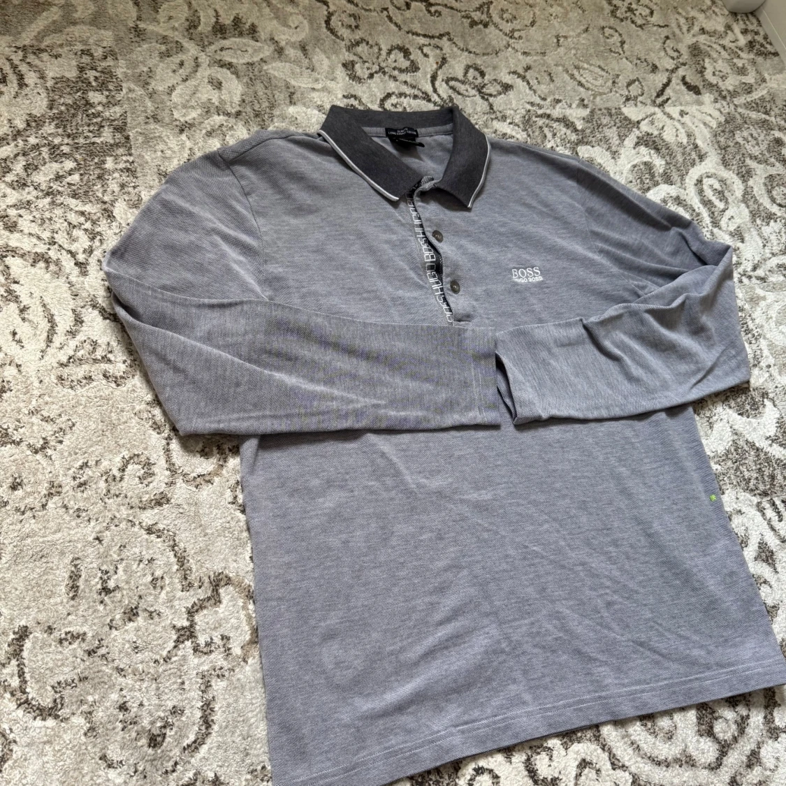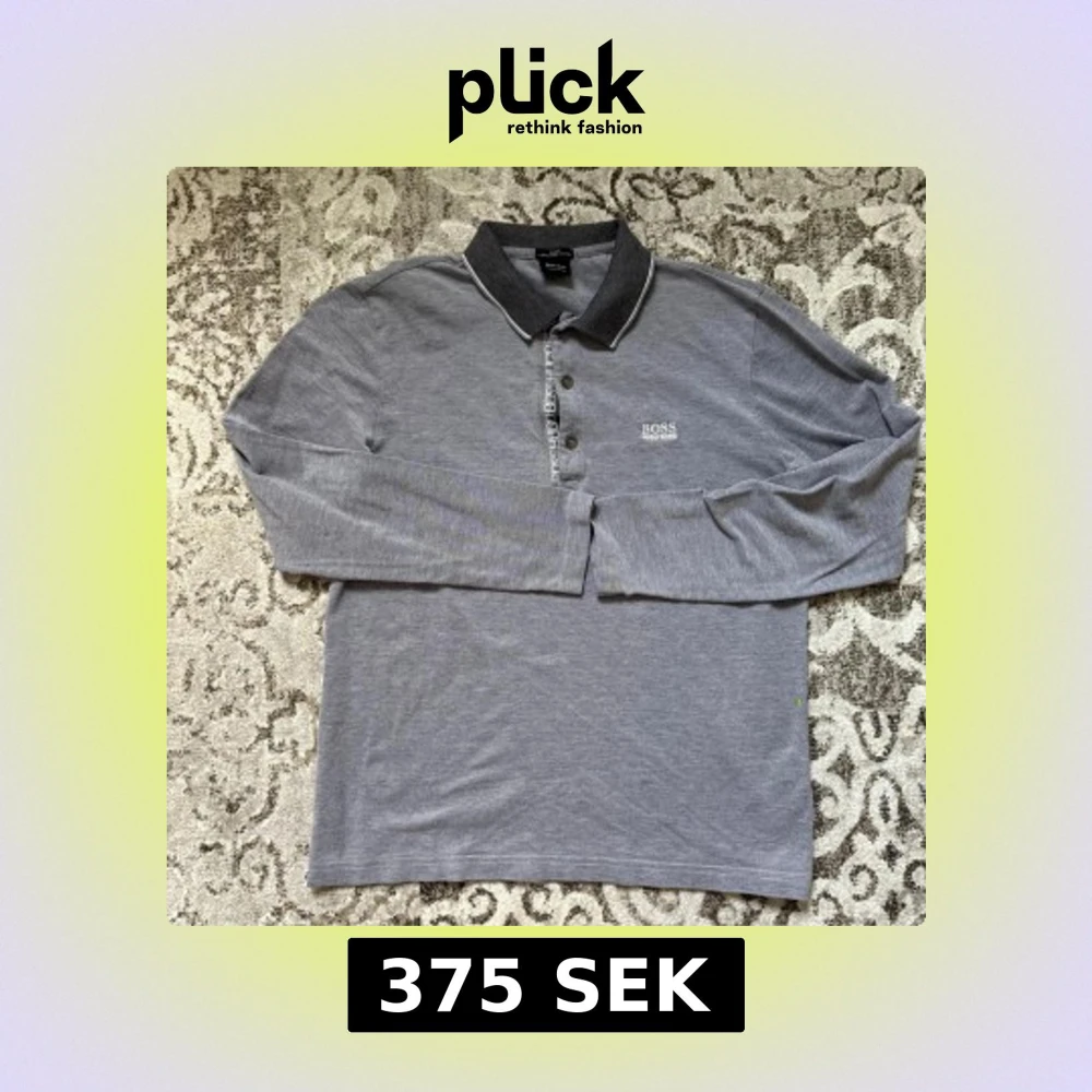 Snygg grå långärmad pikétröja från Hugo Boss med mörkare krage och vit piping. Tröjan har knappar framtill, broderad logga på bröstet och är gjord i mjuk bomull med slim fit-passform. Perfekt för en clean och stilren look. M men passar som S