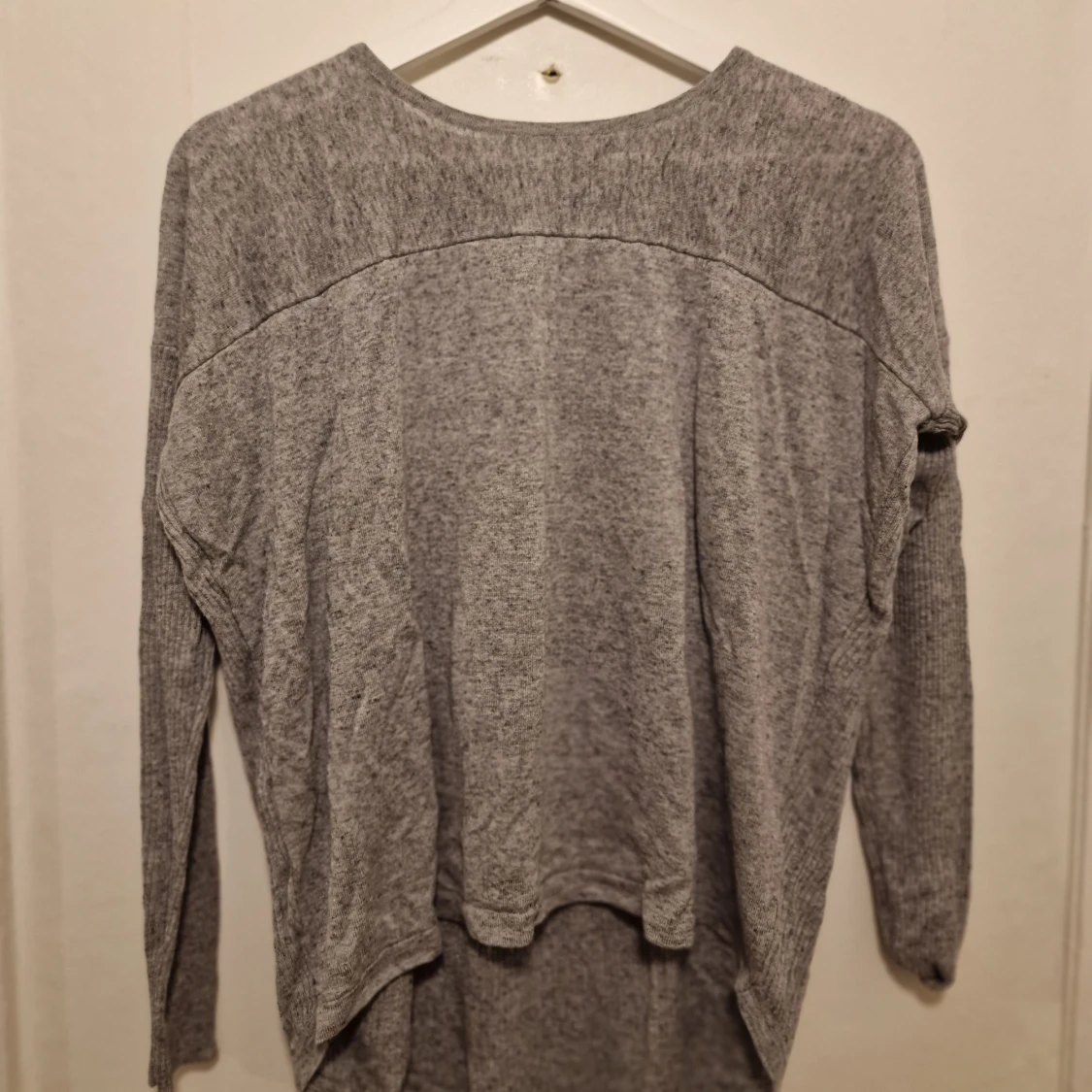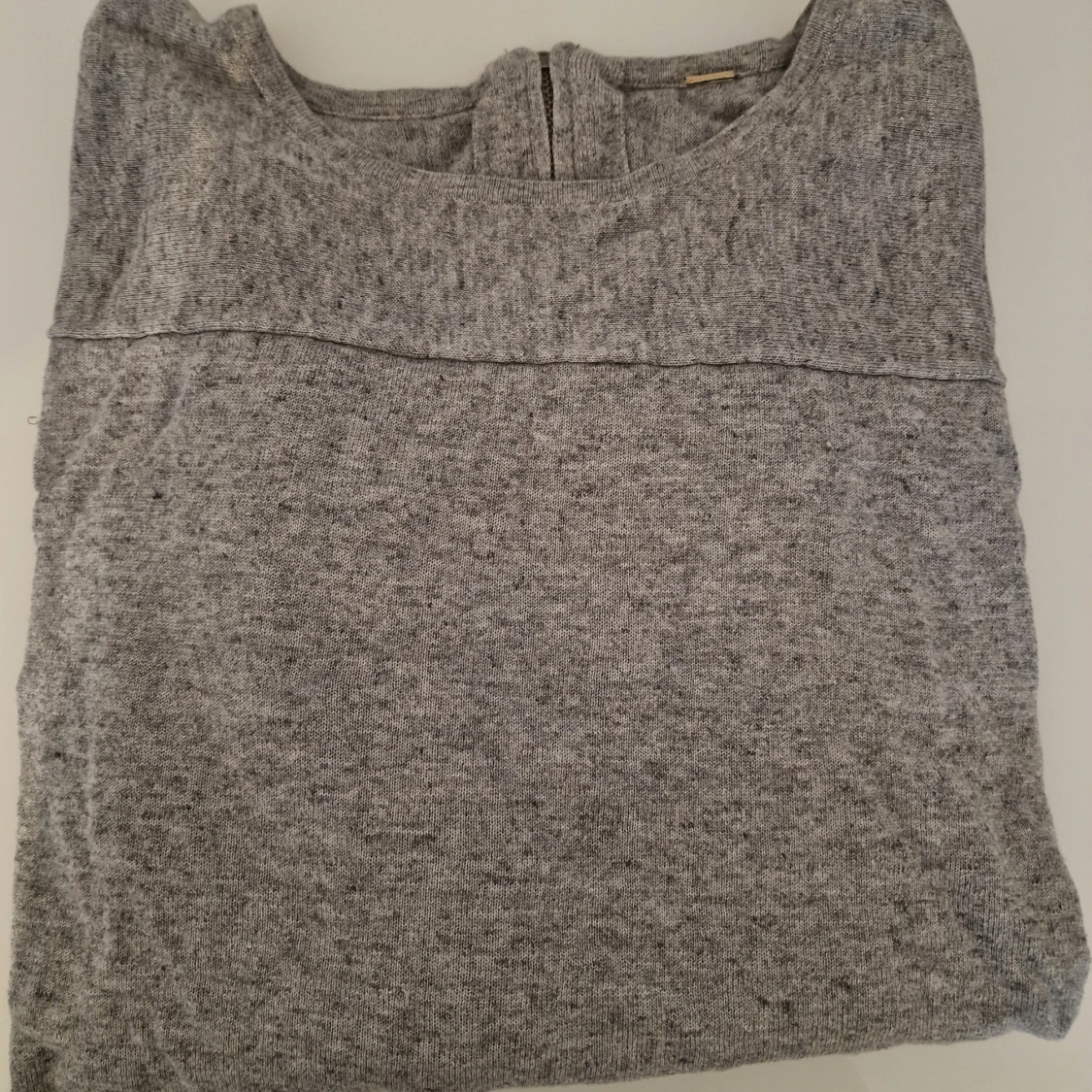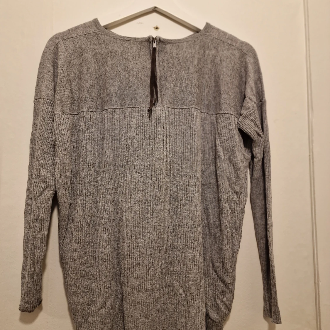 Mysig grå stickad tröja med lång ärm och rund hals. Tröjan har en snygg söm över bröstet och ribbade partier på ärmarna samt en dragkedja i nacken. Perfekt för lager-på-lager och chill dagar.