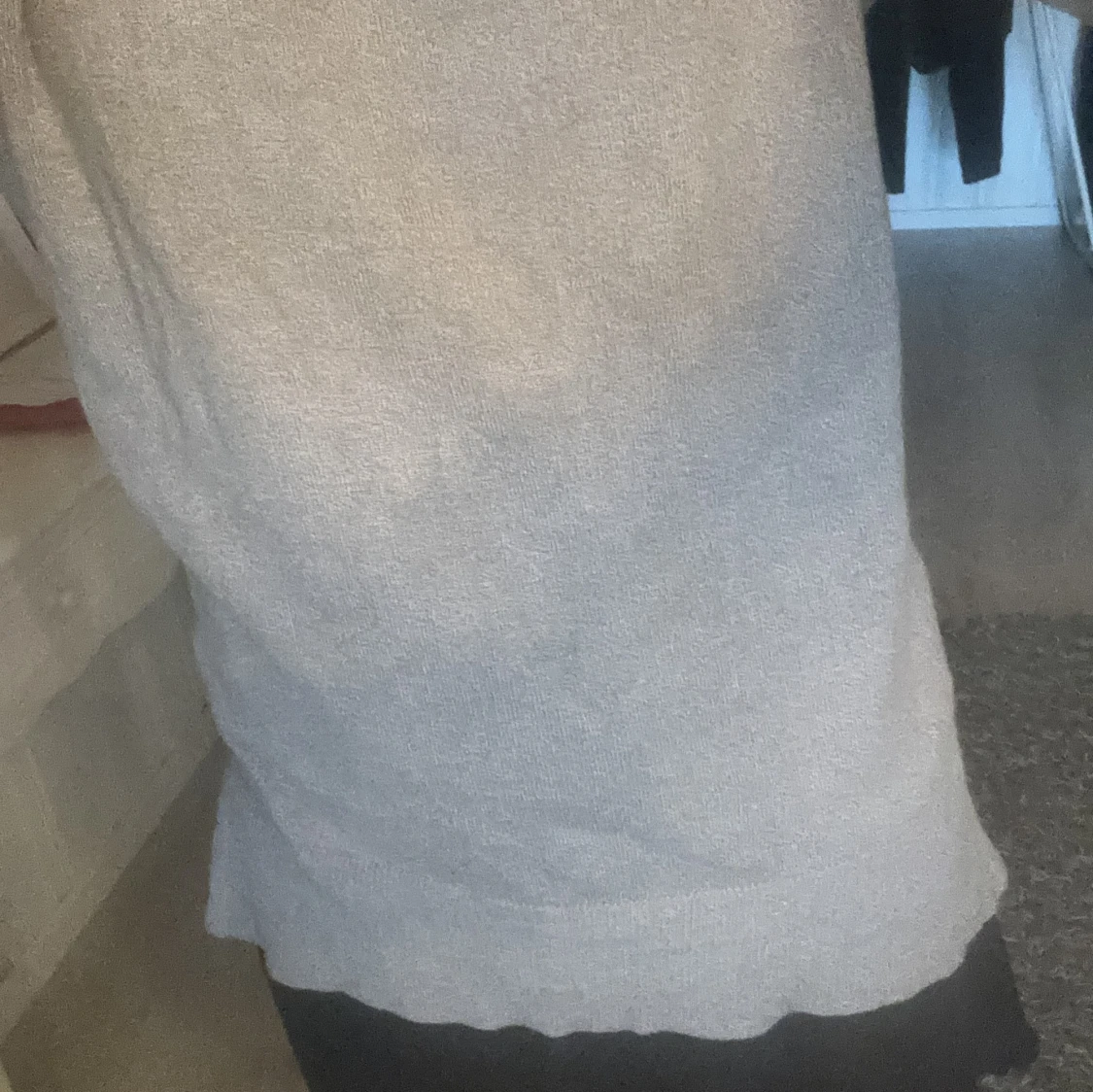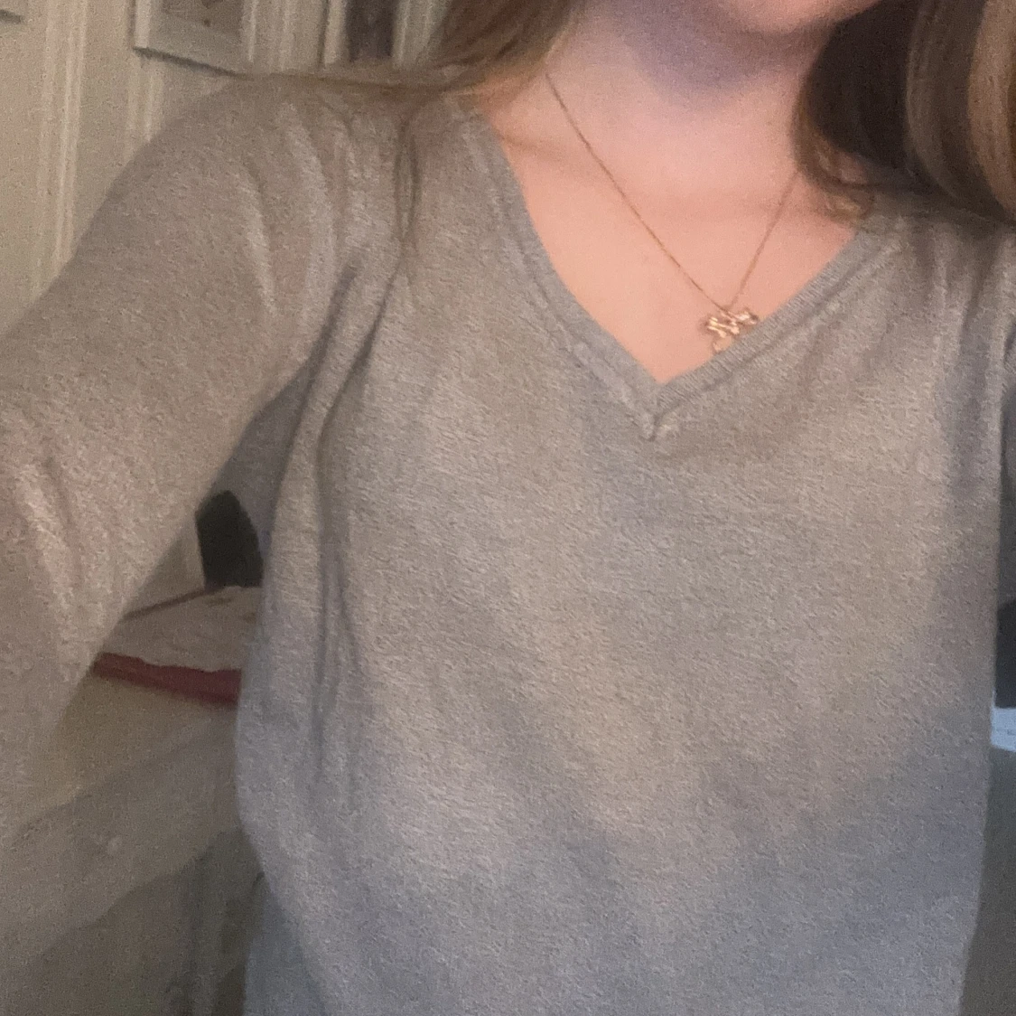 Mysig grå stickad tröja med v-ringning. Tröjan har lång ärm och en enkel, klassisk design som passar perfekt till vardags. Materialet känns mjukt och bekvämt mot huden.