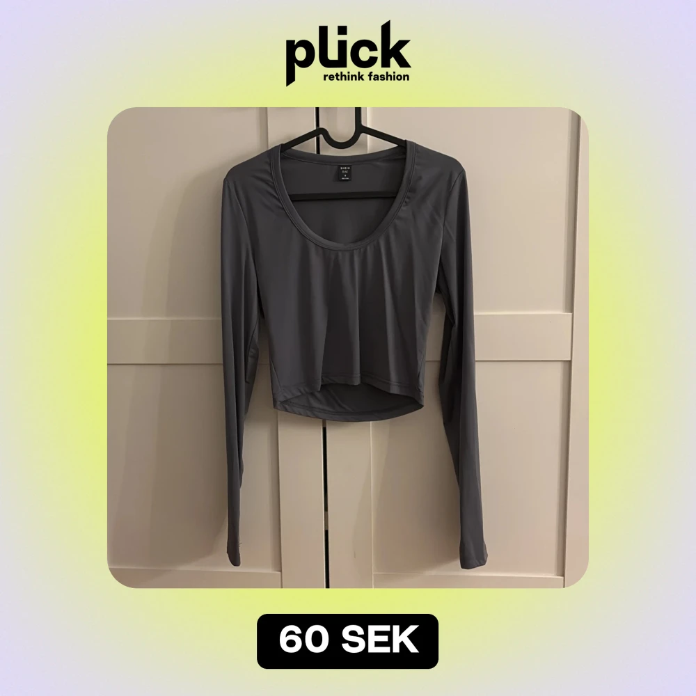 Snygg grå långärmad topp i syntetmaterial. Den har en rundad halsringning och är croppad, vilket ger en modern look. Perfekt för både vardag och festliga tillfällen. Toppen är i mycket bra skick och passar perfekt till jeans eller kjol.