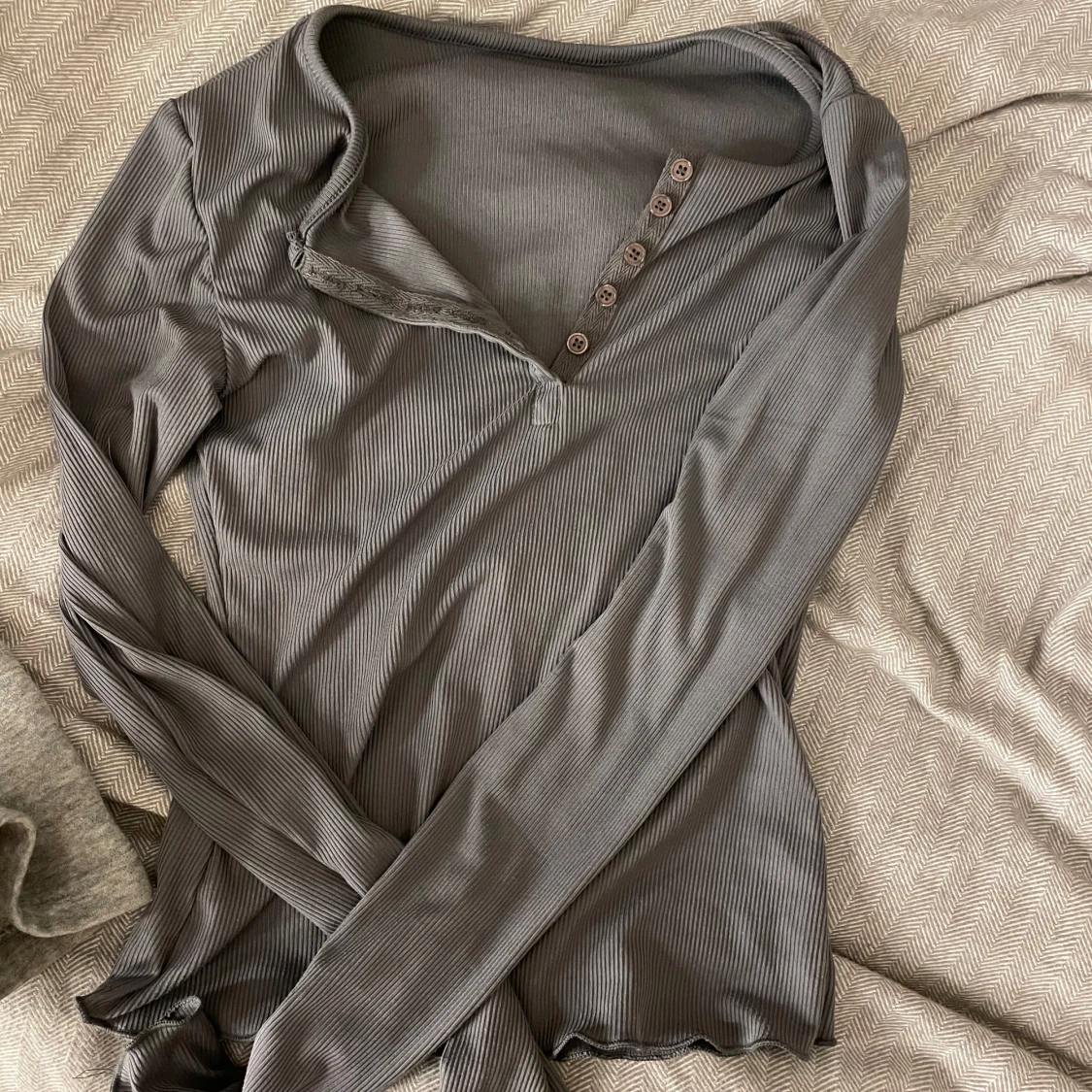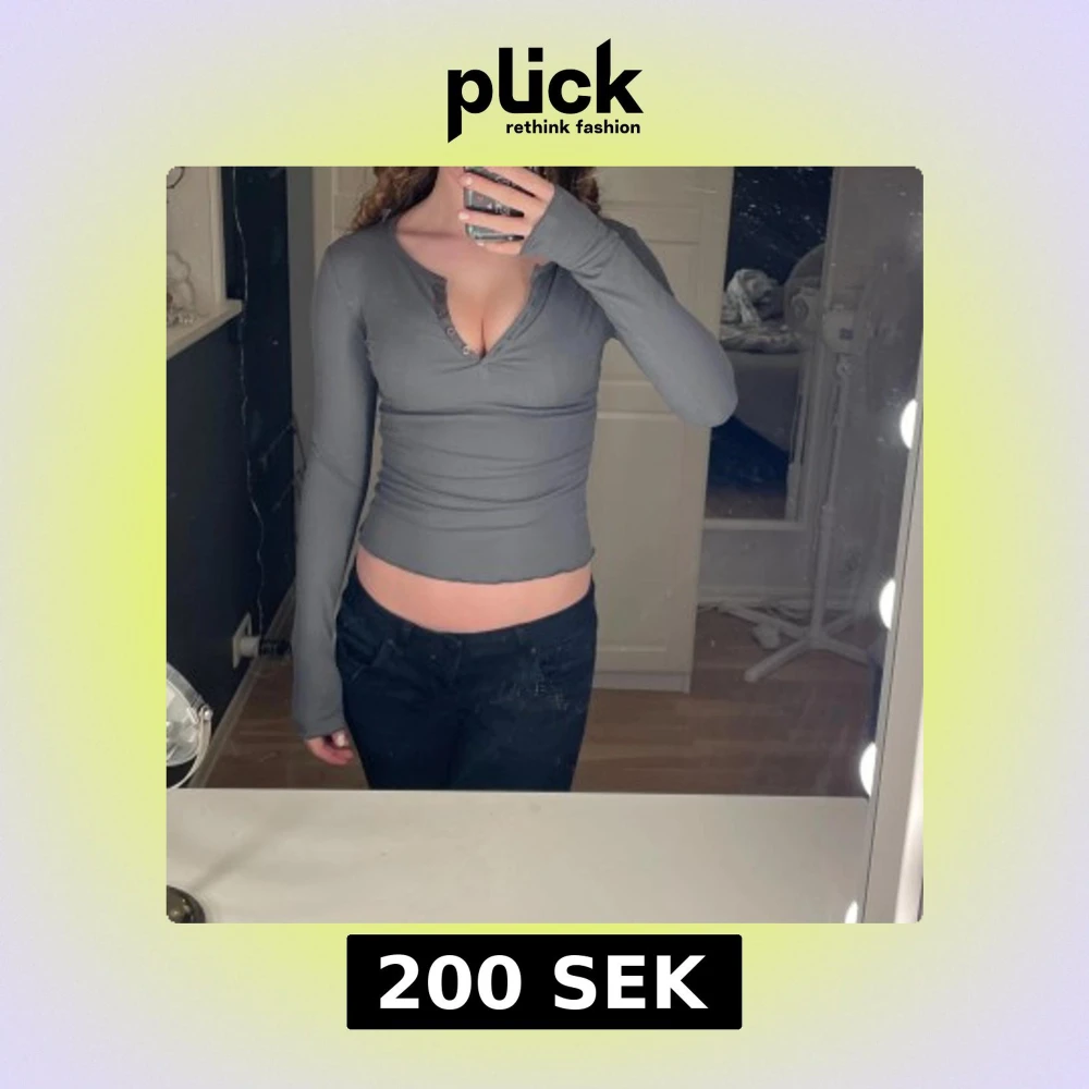 Snygg grå långärmad topp med knappar framtill. Perfekt för en stilren look. Passar bra till både jeans och kjol. Aldrig använd. Passar mig som använder S.🩵🤍