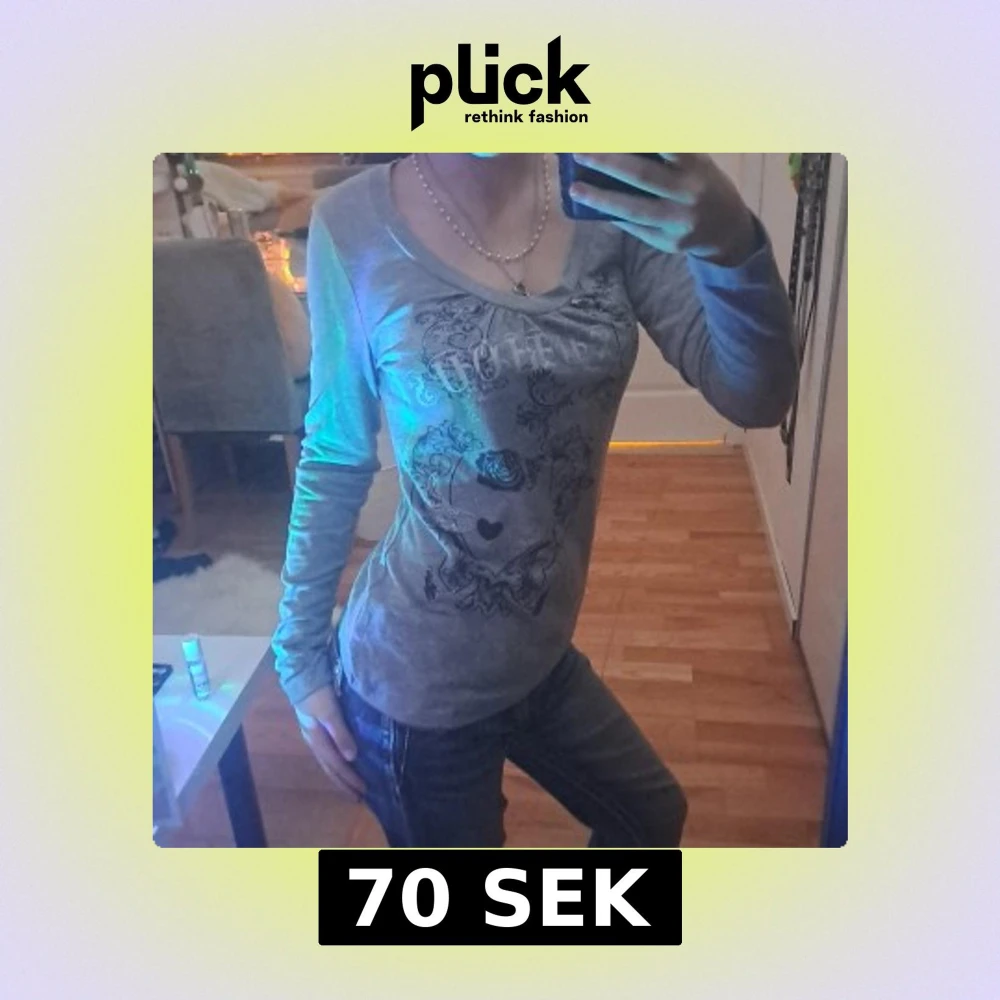 Säljer en grå långärmad topp med snyggt silverfärgat tryck och blommönster framtill. Toppen har en lätt v-ringning och sitter figurnära. Perfekt för dig som gillar detaljer och vill sticka ut lite extra.