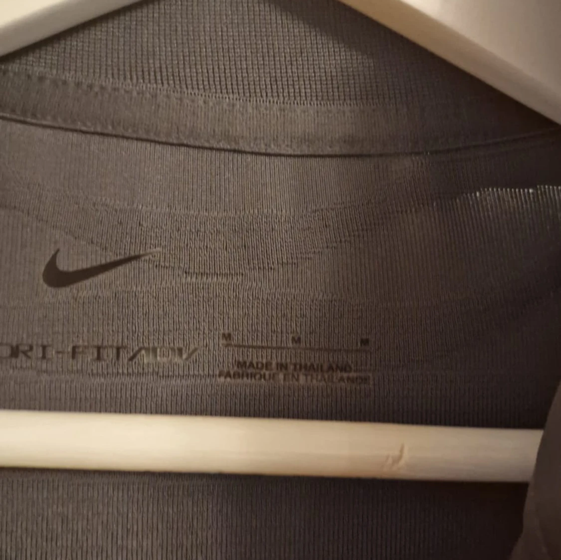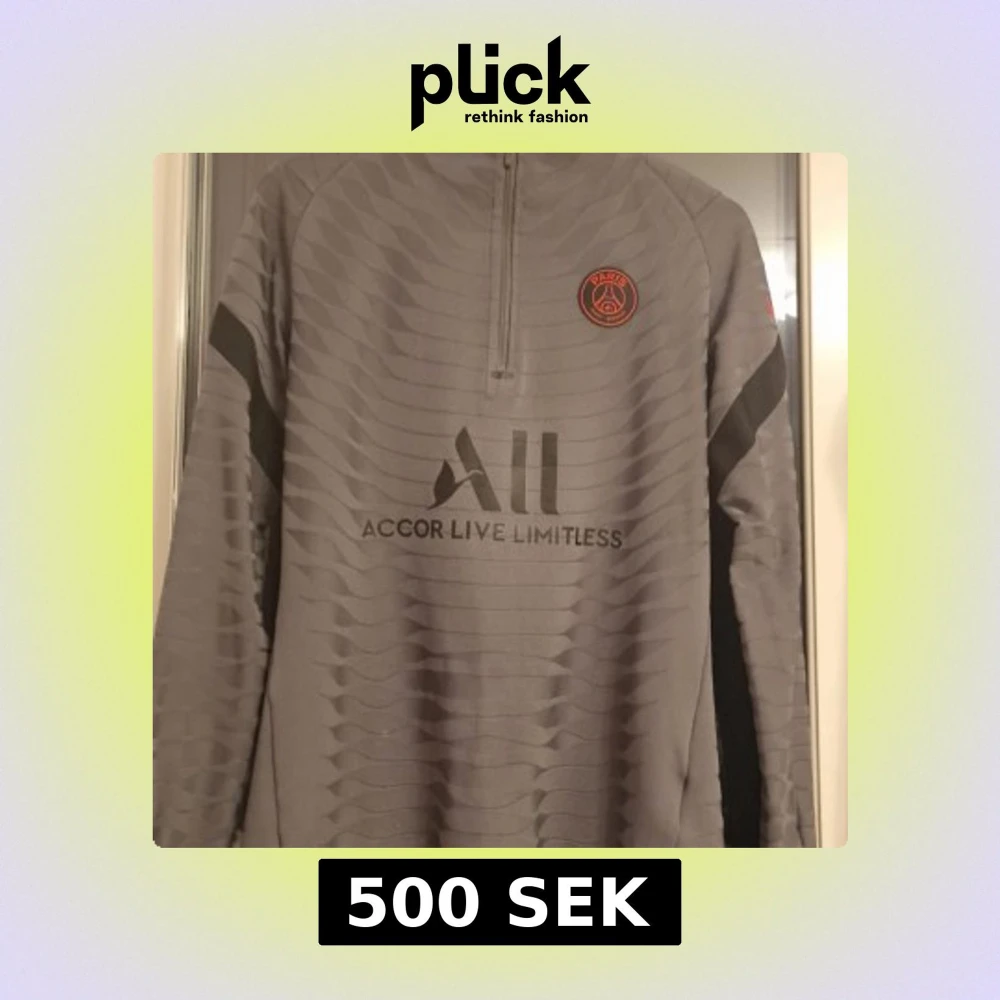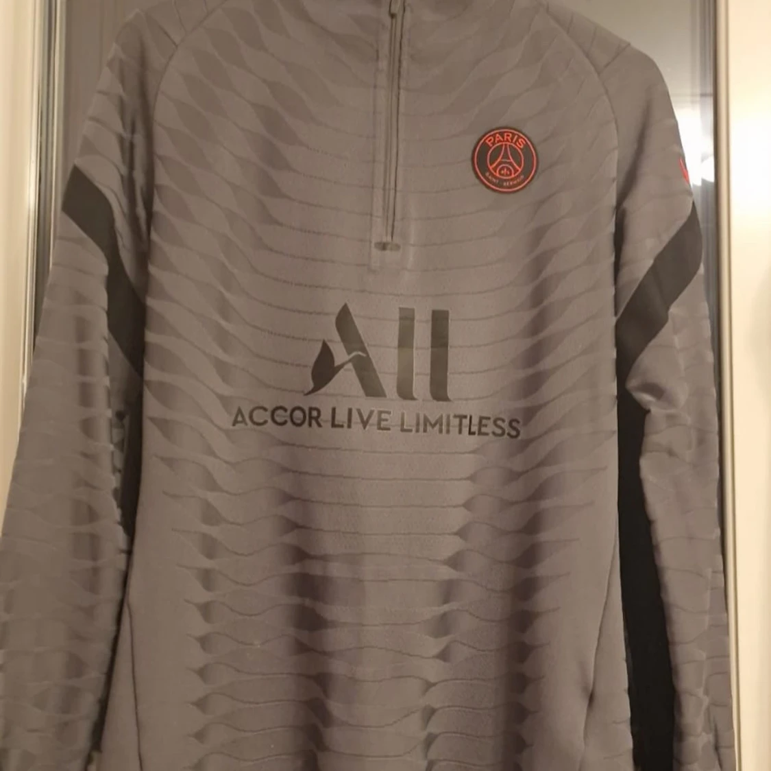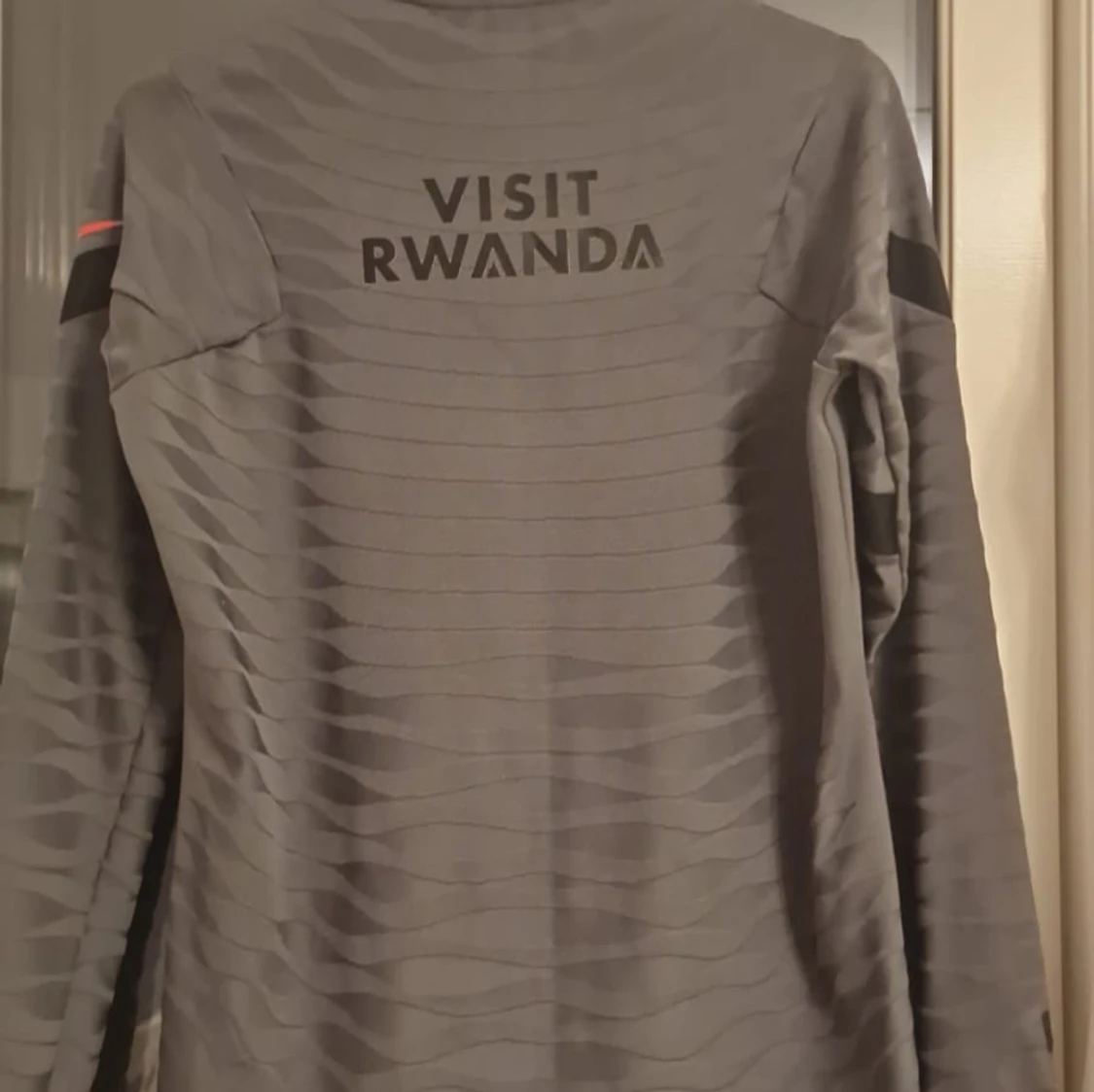 Säljer en grå långärmad tröja från Nike med Paris Saint-Germain-logga på bröstet. Tröjan har en dragkedja vid halsen och texten 'Accor Live Limitless' samt 'Visit Rwanda' tryckt på framsidan och baksidan. Perfekt för fotbollsfans!