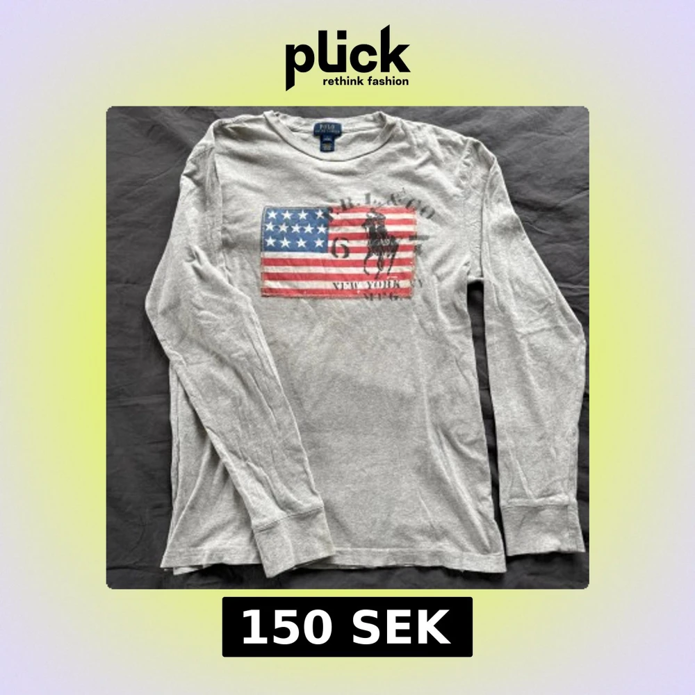 Säljer en grå långärmad tröja från Ralph Lauren med ett tryck av en amerikansk flagga och en häst. Perfekt för en avslappnad stil. Tröjan är tillverkad i ett mjukt material som känns skönt mot huden. Storlek 14-16 Passar S