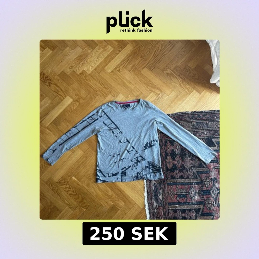 Säljer en grå långärmad tröja från Tommy Hilfiger i storlek L. Tröjan har ett svart grafiskt tryck på framsidan och en röd detalj vid halsringningen. Perfekt för en avslappnad stil.