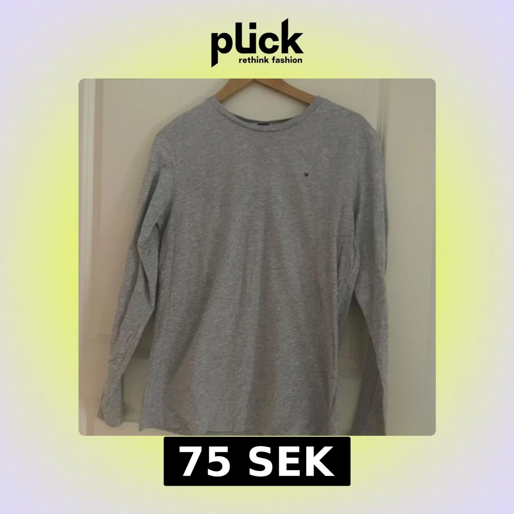 Säljer en stilren grå långärmad tröja från Tommy Hilfiger i ekologisk bomull. Tröjan har en liten logotyp på bröstet och är perfekt för en avslappnad stil. Passar bra till både jeans och chinos.