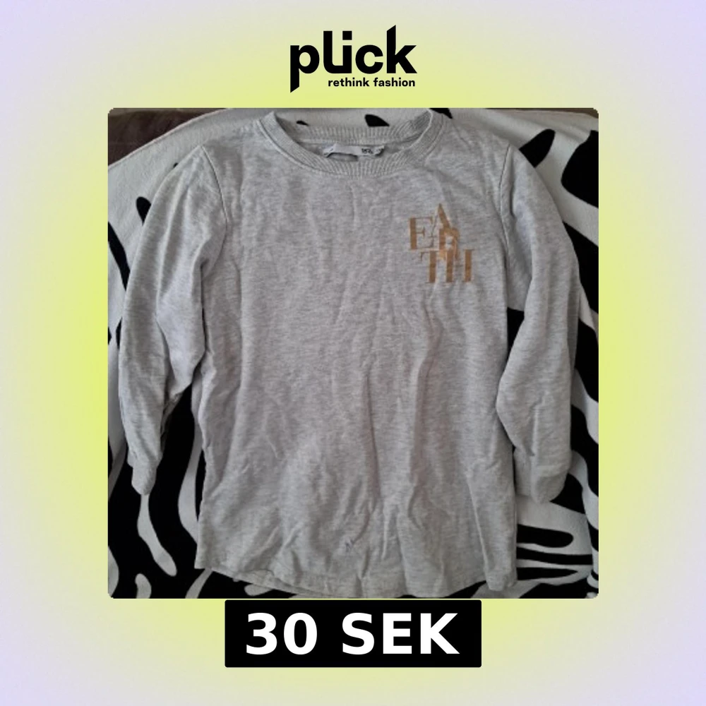 Grå långärmad tröja i mjuk bomull med ribbade muddar och rund hals. På bröstet finns ett stilrent tryck i guld med texten 'EARTH'. Den är I bra skick, men har två fläckar som syns på bilderna. Storlek 130
