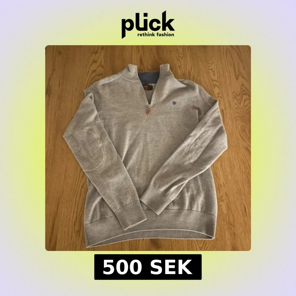 Snygg grå långärmad tröja från Morris i 100% merinoull. Tröjan har half zip med läderdetalj på dragkedjan och en broderad blå logga på bröstet. Ribbstickade muddar och krage med blå insida ger en clean och stilren look. Tröjan är i storlek M men passar som S
