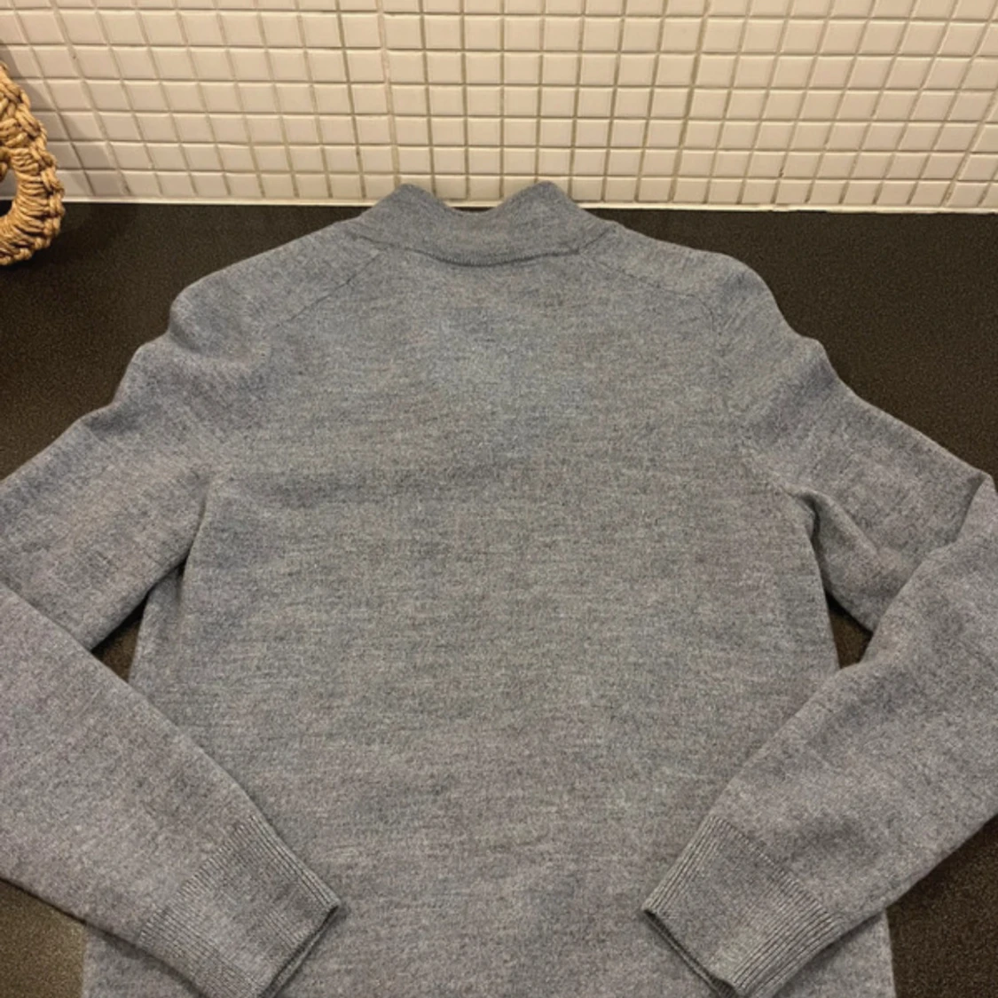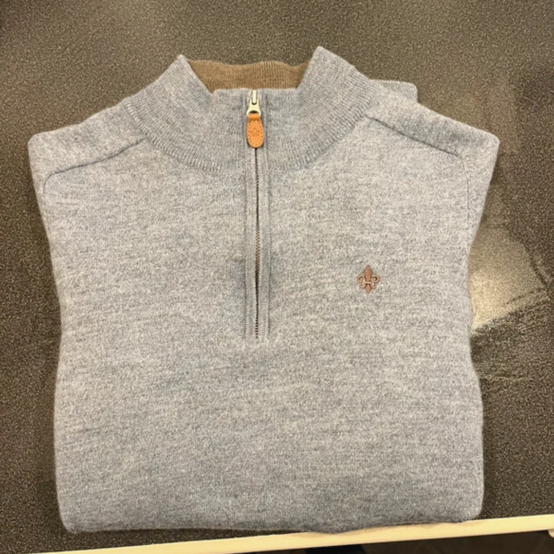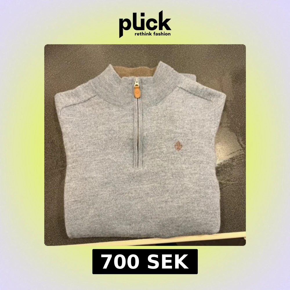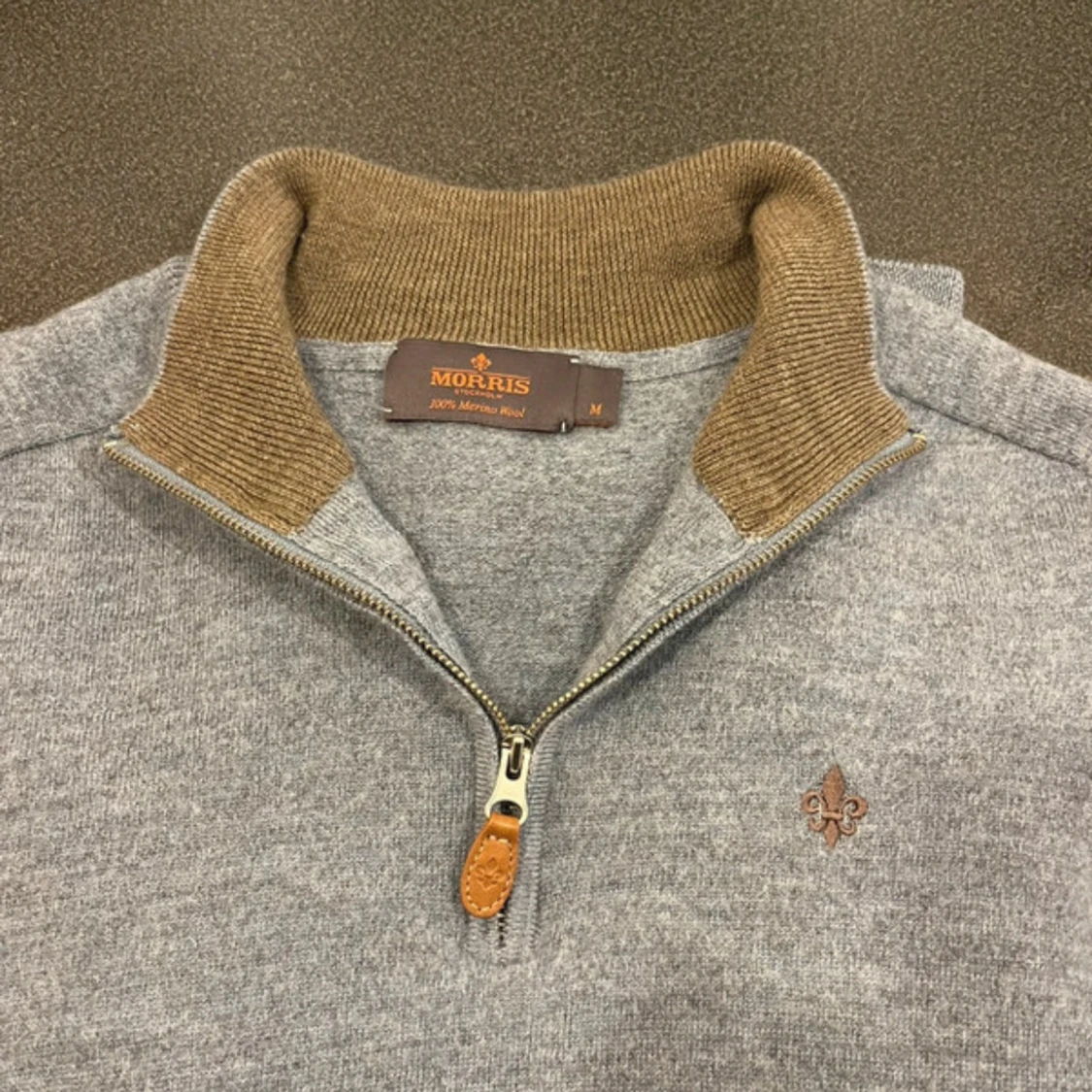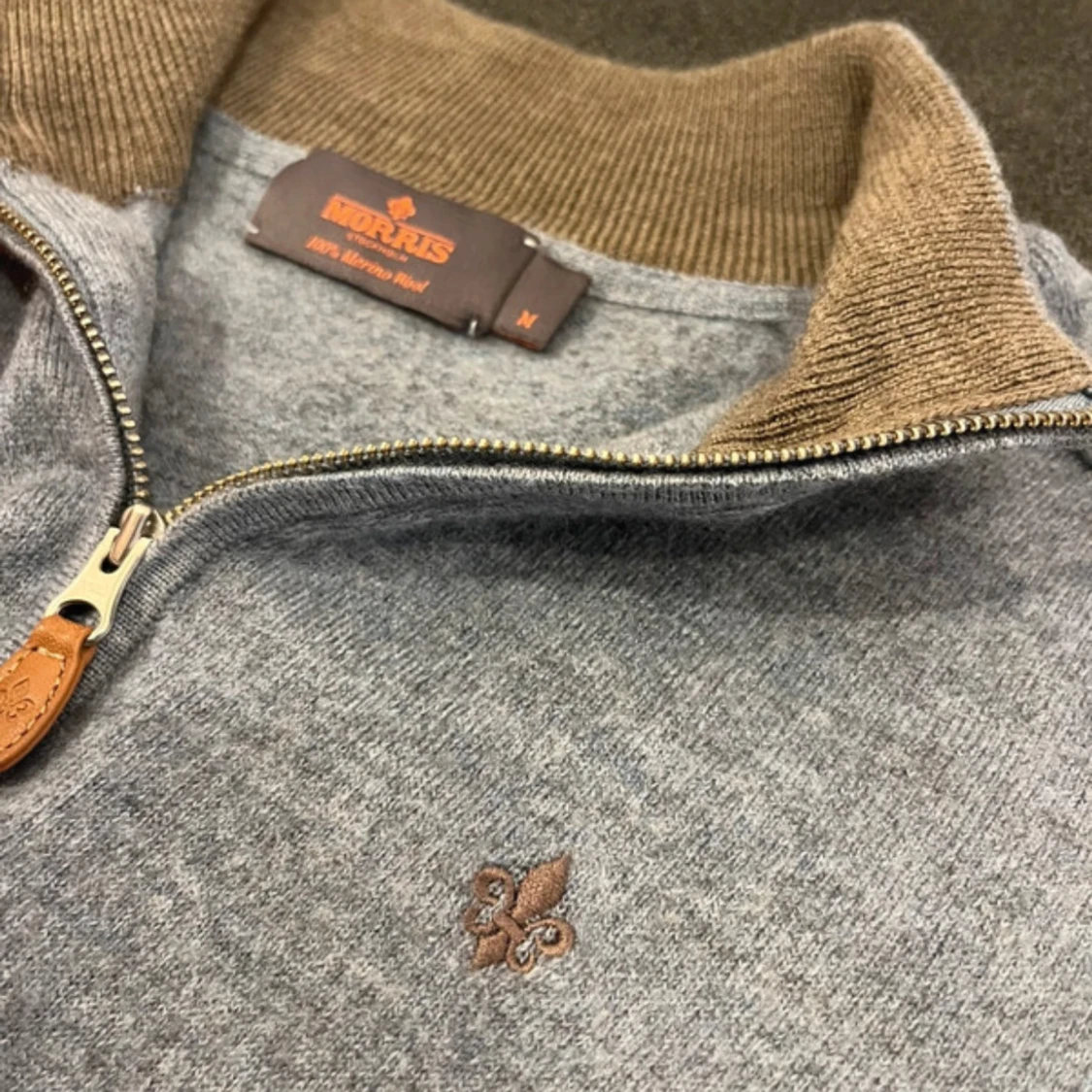Snygg grå stickad tröja från Morris i 100% merinoull med halv dragkedja och kontrastfärgad brun insida på kragen. Broderad logga på bröstet och ribbade muddar. Perfekt för lager-på-lager under kyliga dagar.