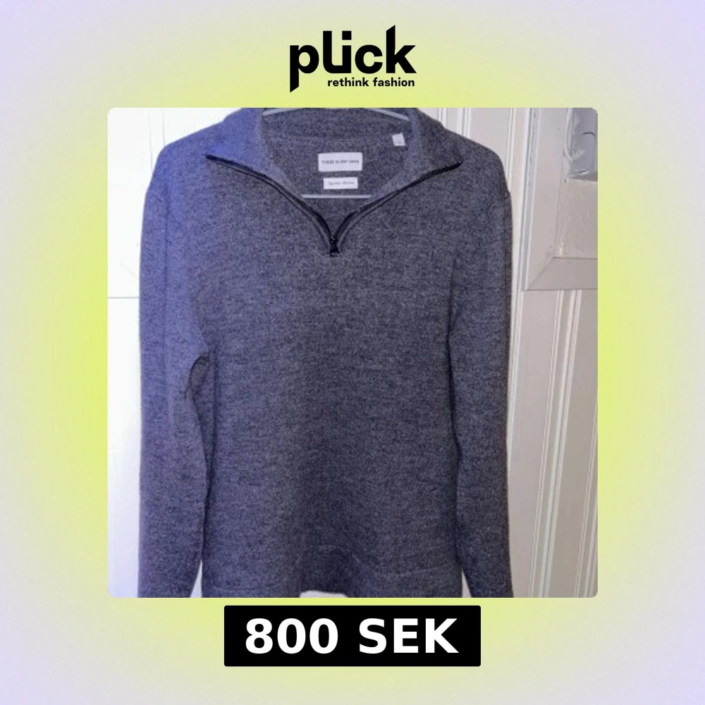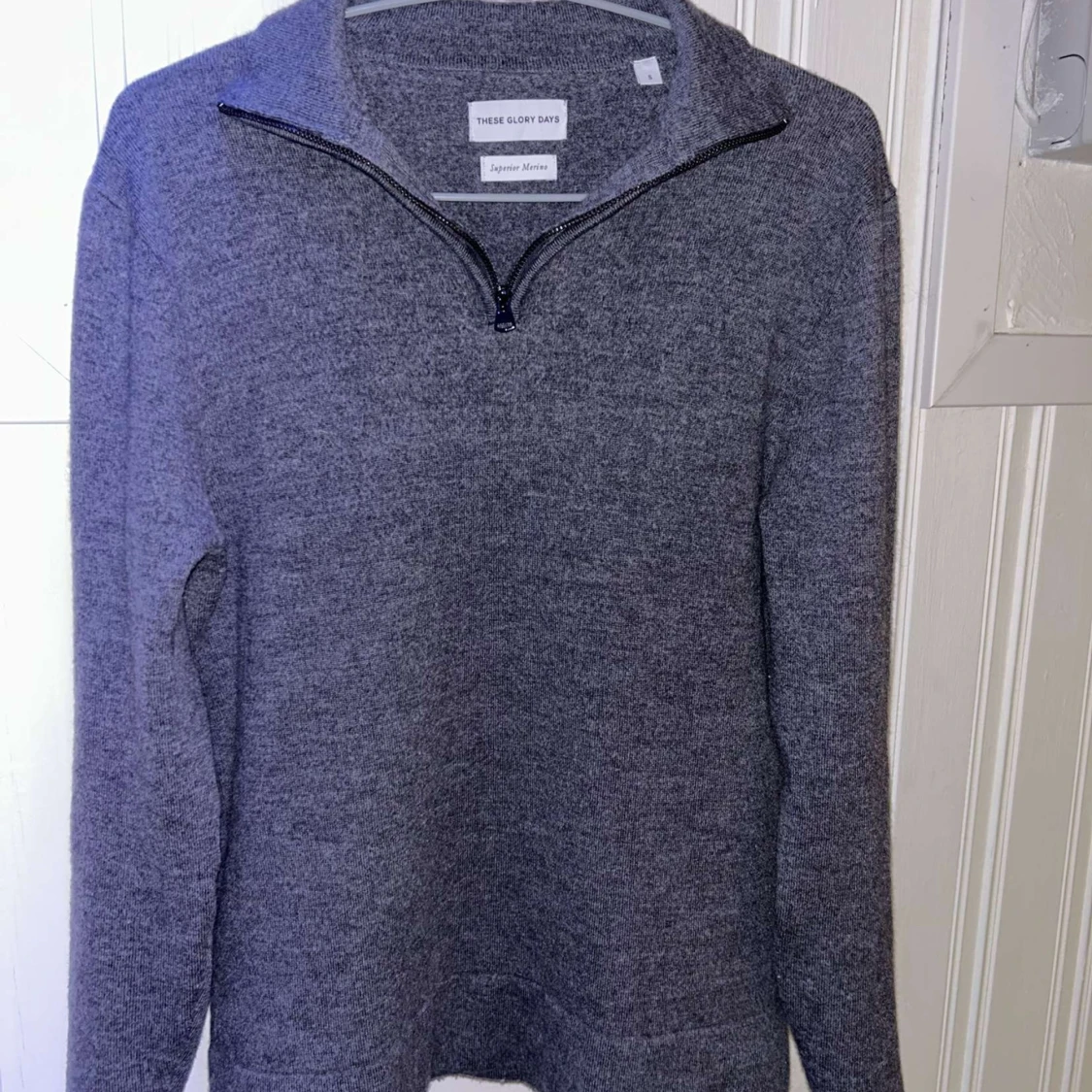 Säljer en stilren grå tröja från These Glory Days i superior merinoull. Tröjan har en praktisk dragkedja vid halsen och långa ärmar.