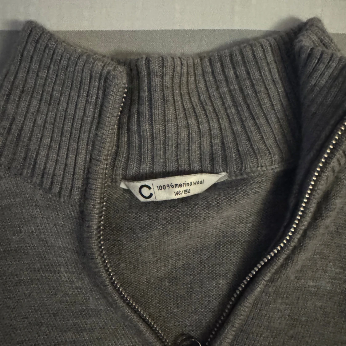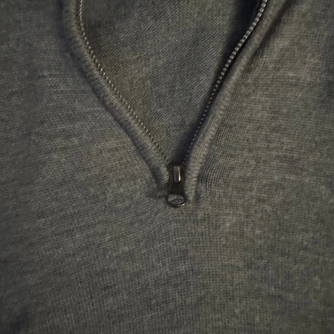 Mysig grå tröja i 100% merinoull från C. Tröjan har ribbad krage och muddar samt en snygg half zip-dragkedja vid halsen. Perfekt för lager-på-lager och passar till både jeans och chinos. Passar 160