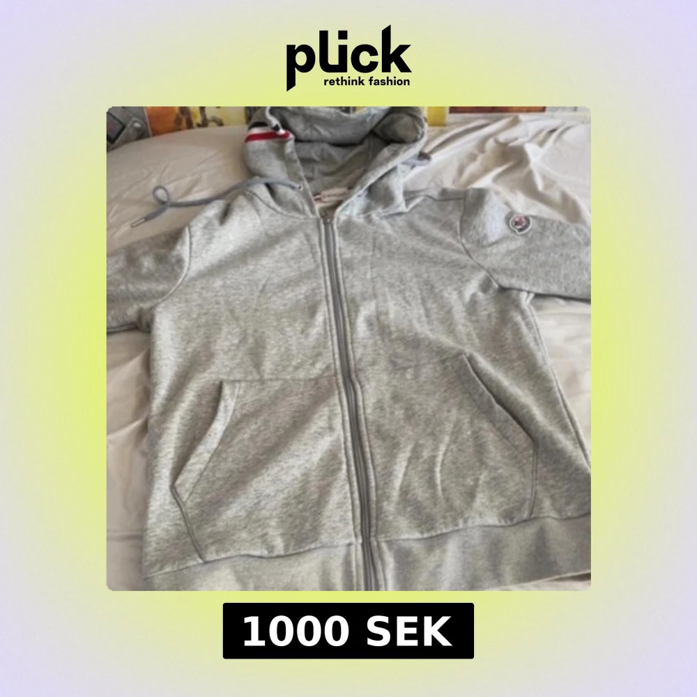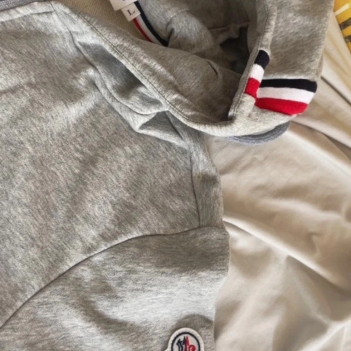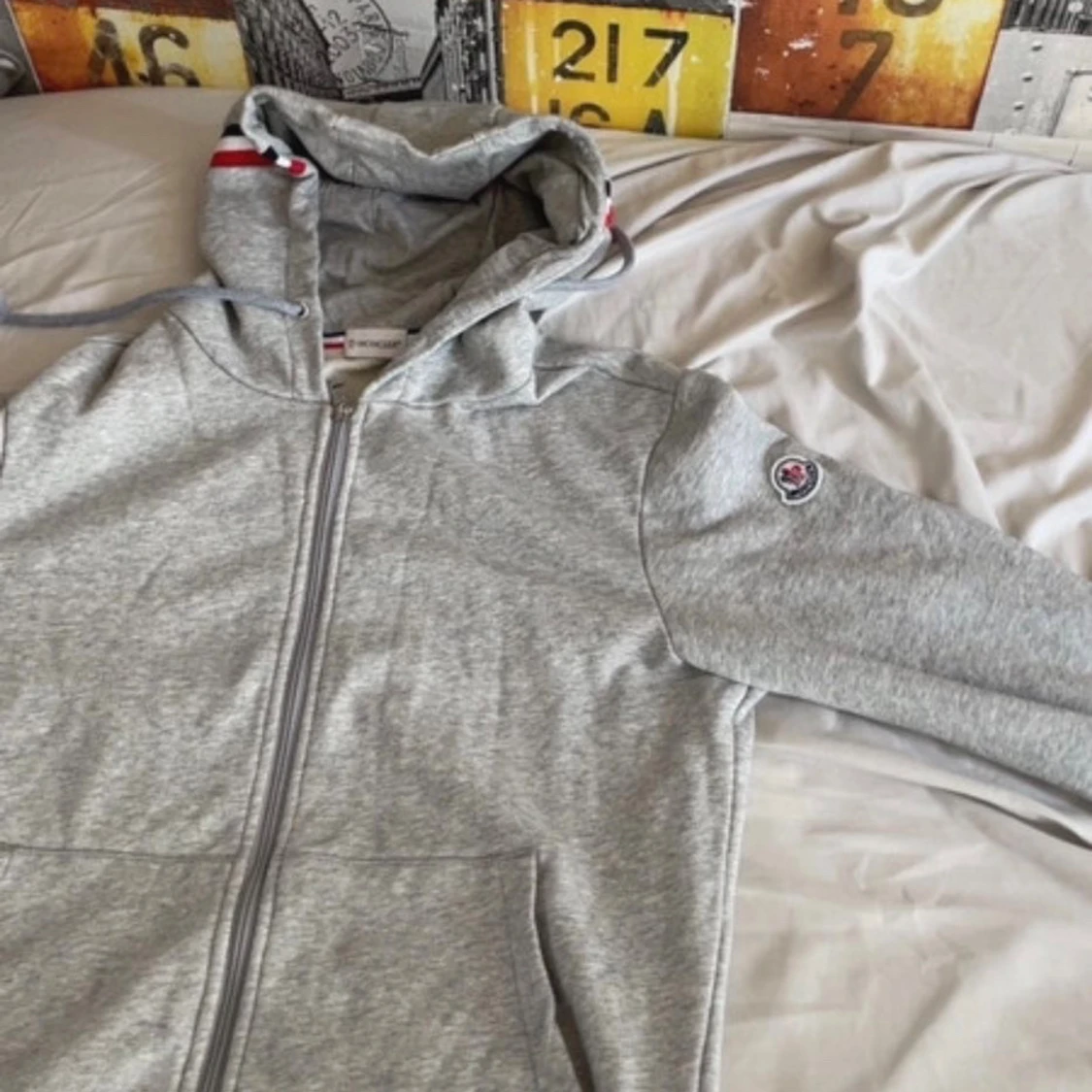 Snygg grå hoodie från Moncler med hel dragkedja, huva med snörning och röd, vit och marinblå randdetalj. Tröjan har två fickor framtill och Moncler-logga på ärmen. Perfekt för chill dagar och streetstyle.