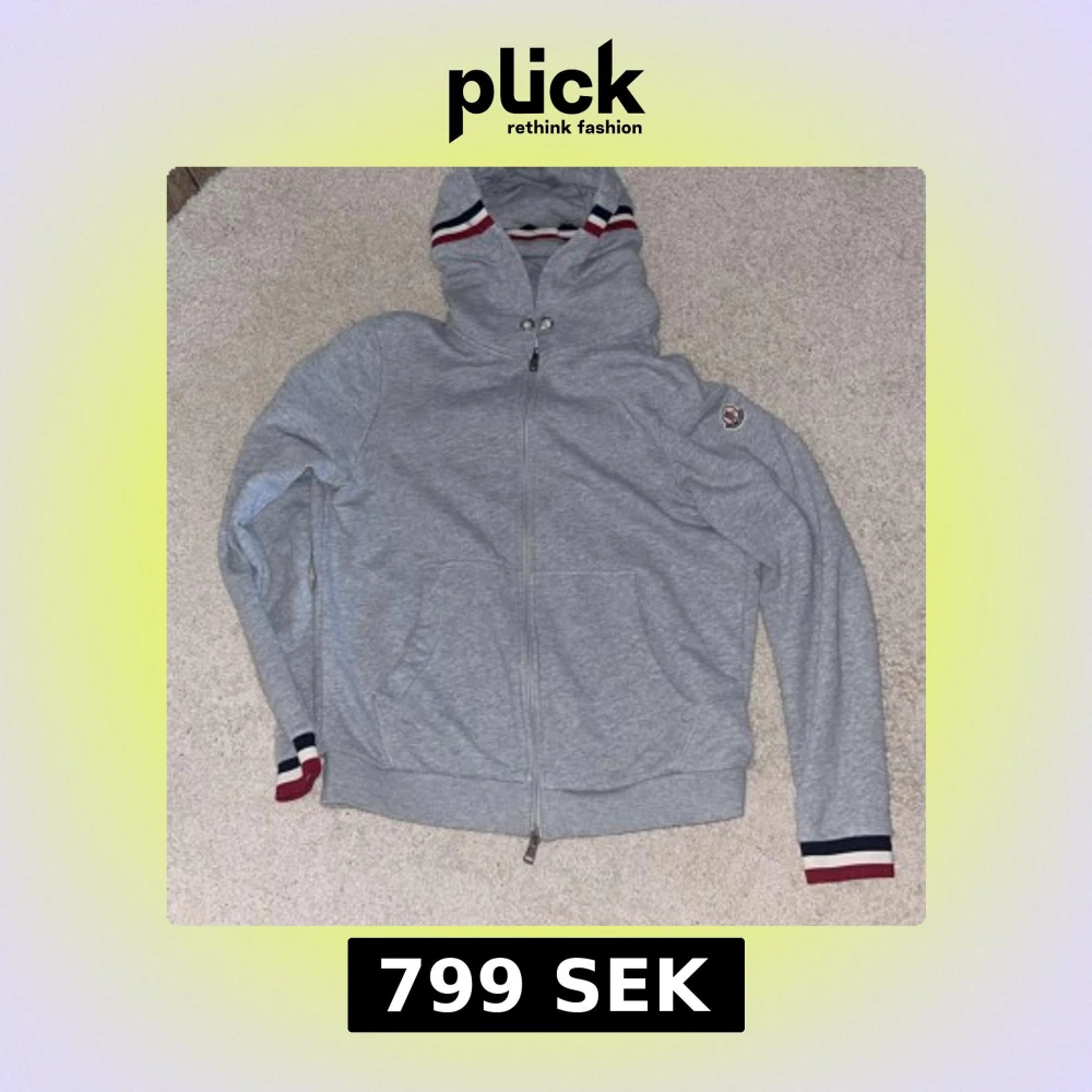 Snygg grå hoodie från Moncler med hel dragkedja, huva och Moncler-logga på ärmen. Ribbade muddar med röd, vit och marinblå rand. Perfekt för chill dagar och streetstyle. Tillverkad i mjuk bomull för maximal komfort. Passform är M - L