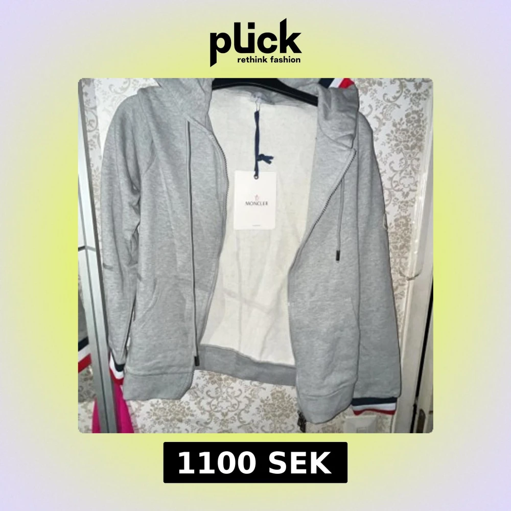 Snygg grå hoodie från Moncler med dragkedja, huva och Moncler-logga på ärmen. Muddarna har stilrena ränder i blått, vitt och rött. Tillverkad i mjuk bomull, perfekt för chill dagar. Klassisk passform och riktigt clean look. Pris kan diskuteras