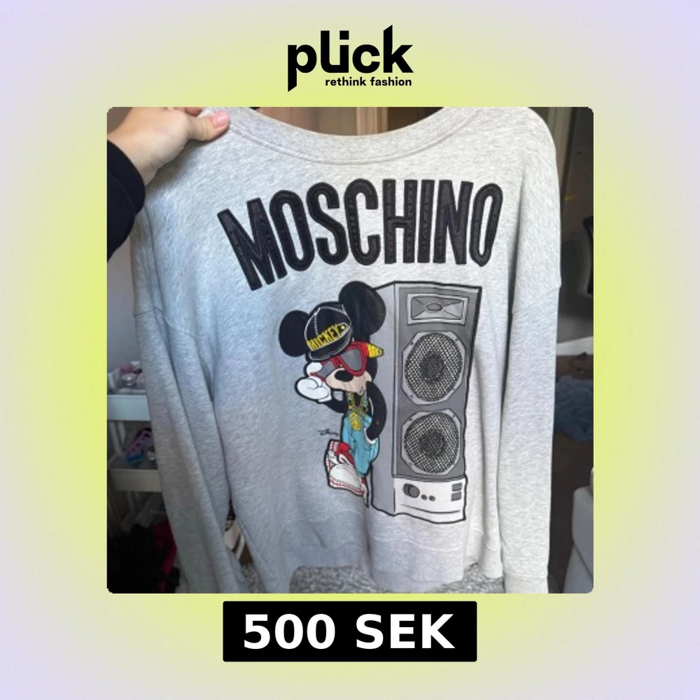 Snygg grå sweatshirt från Moschino med stort tryck av Mickey Mouse i streetstyle och högtalare på framsidan. Tröjan har rund hals, långa ärmar och är i mjuk bomullsmix. Perfekt statement piece för dig som gillar coola prints och designerplagg.