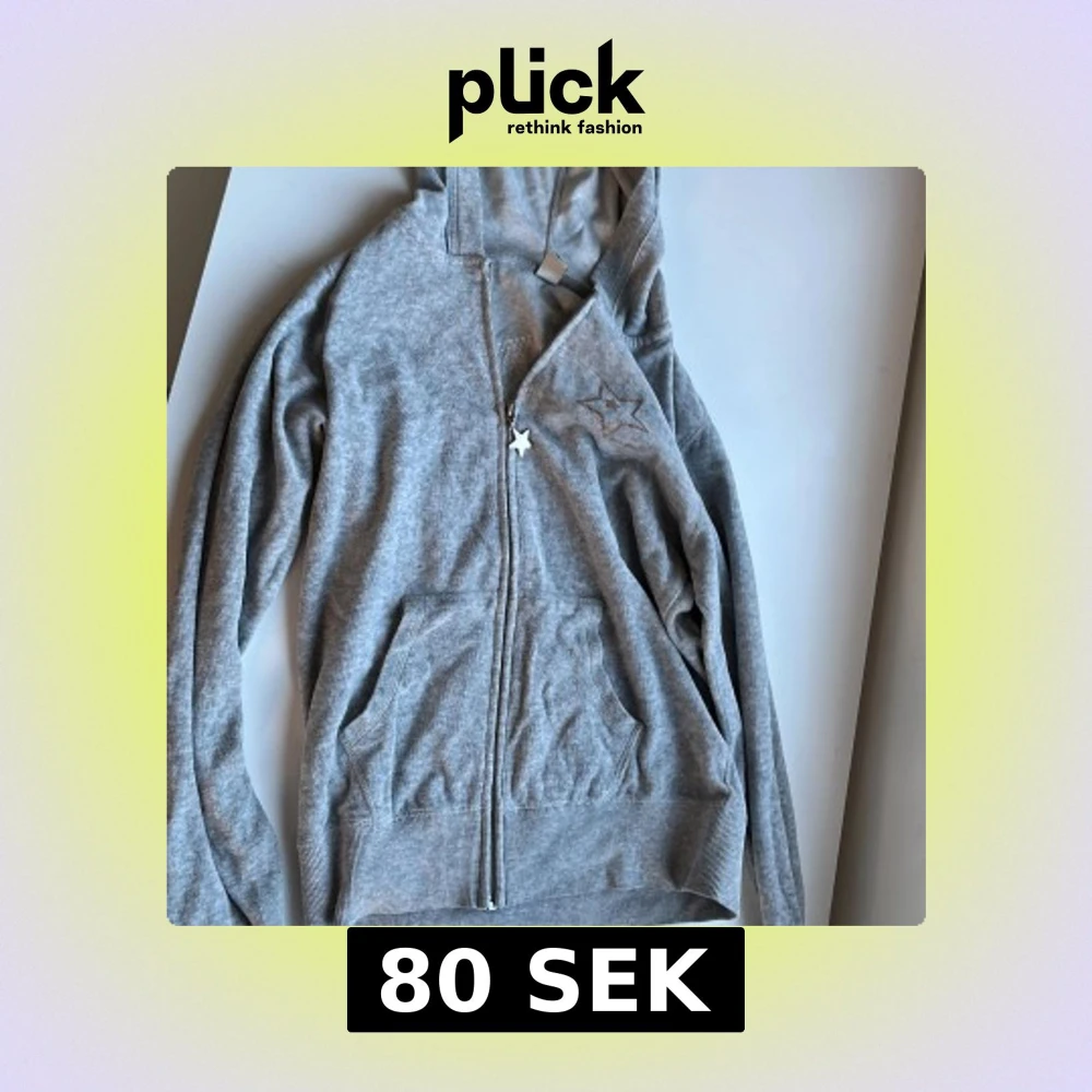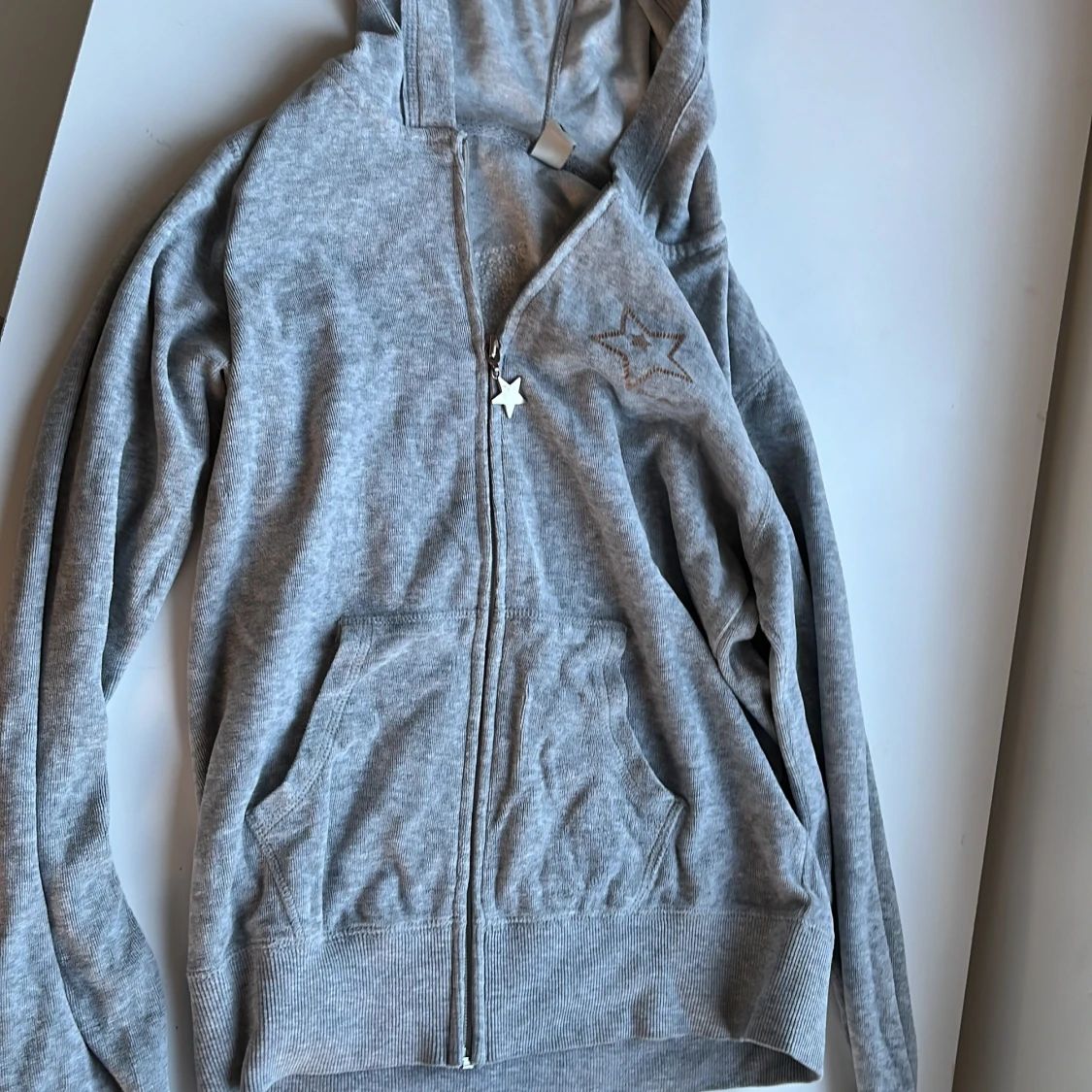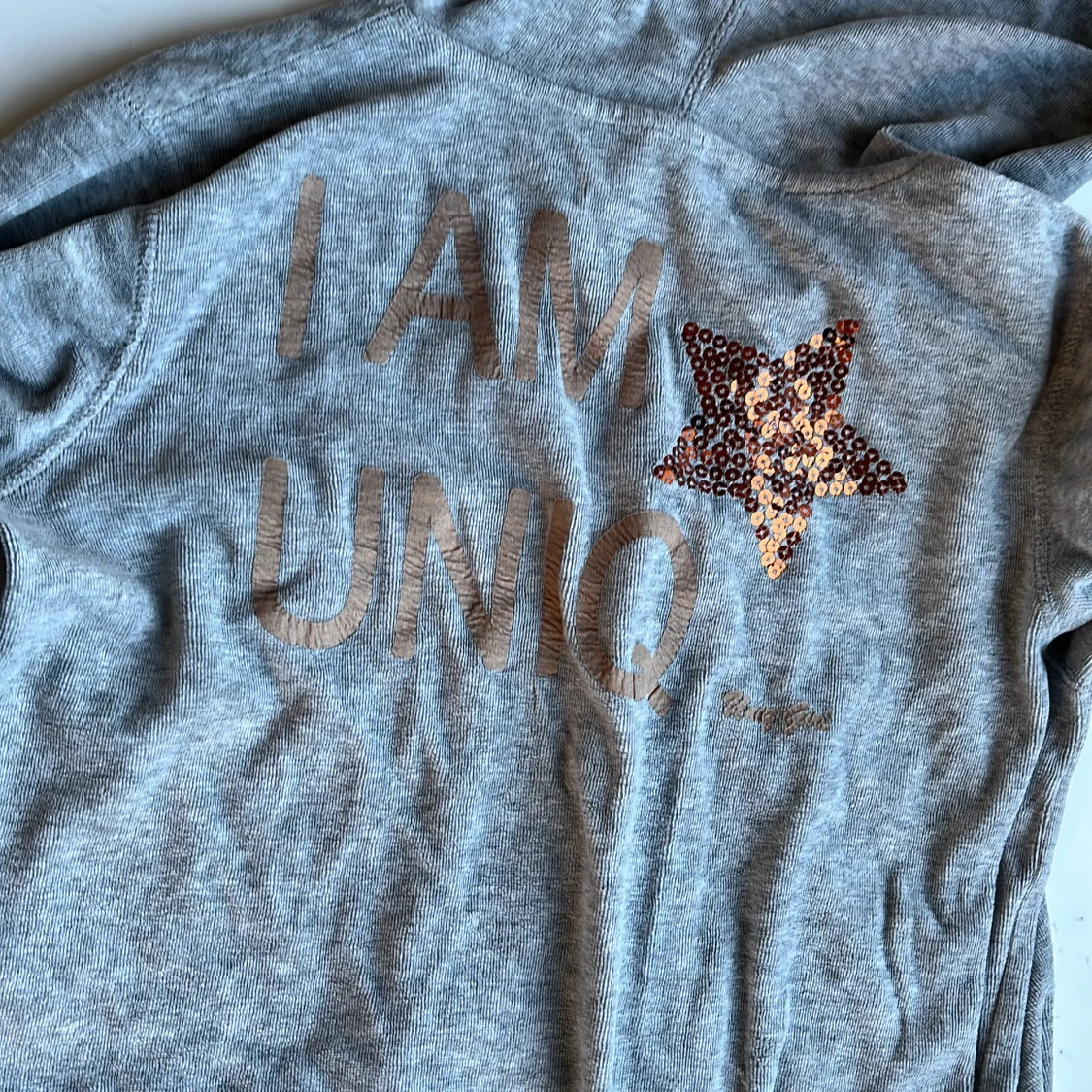 Säljer en grå munkjackan med dragkedja och huva. Den har en stjärna i paljetter på bröstet och texten 'I AM UNIQUE' med en stjärna på ryggen. Perfekt för en avslappnad stil. STORLEK 146/152