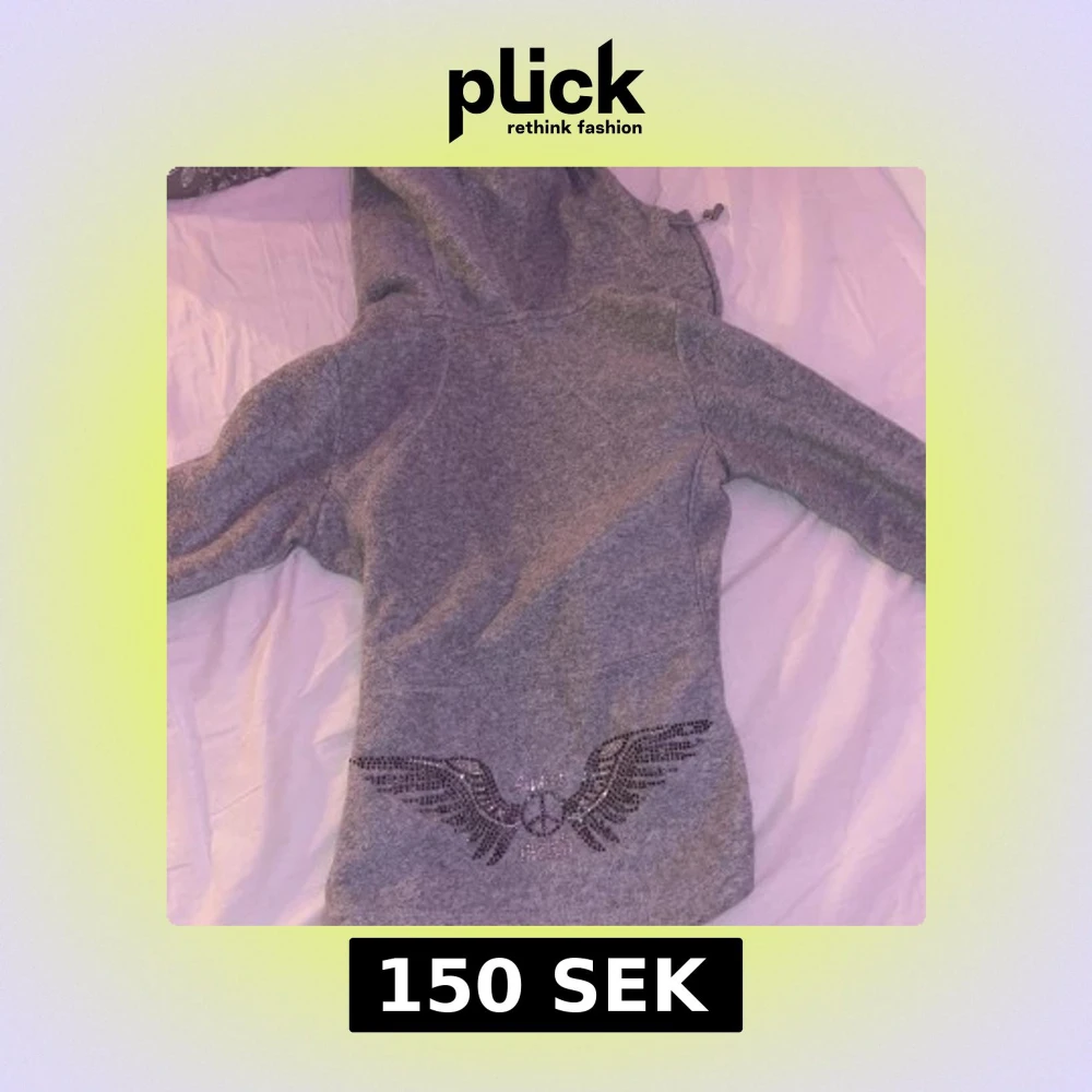 Säljer en grå hoodie från H&M med glittrande detaljer i form av vingar. Tröjan har en dragkedja framtill och en mysig huva med dragsko. Perfekt för en avslappnad stil med lite extra bling! Varan är i bra form och har använts 2 gånger.
