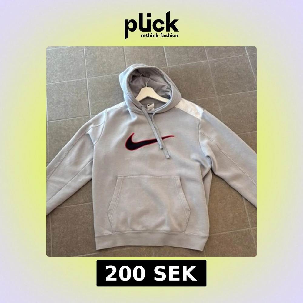 Säljer en grå hoodie från Nike med stor svart och röd logga på bröstet. Tröjan har huva med snörning, en stor magficka och långa ärmar. Perfekt för chill dagar eller när du vill ha en sportig look. Kvitto finns. Från stadium. Storlek M men passar som S.