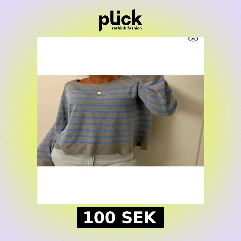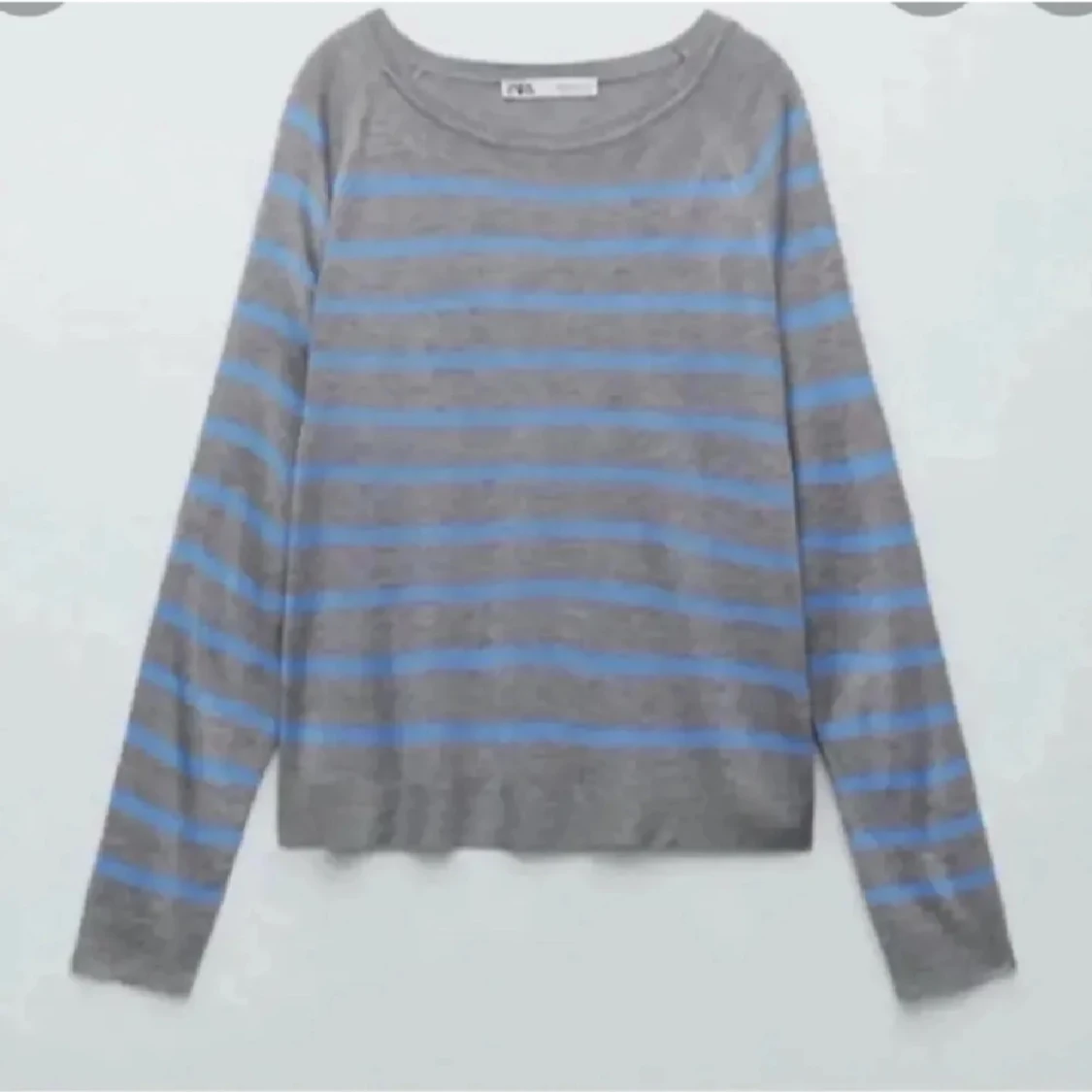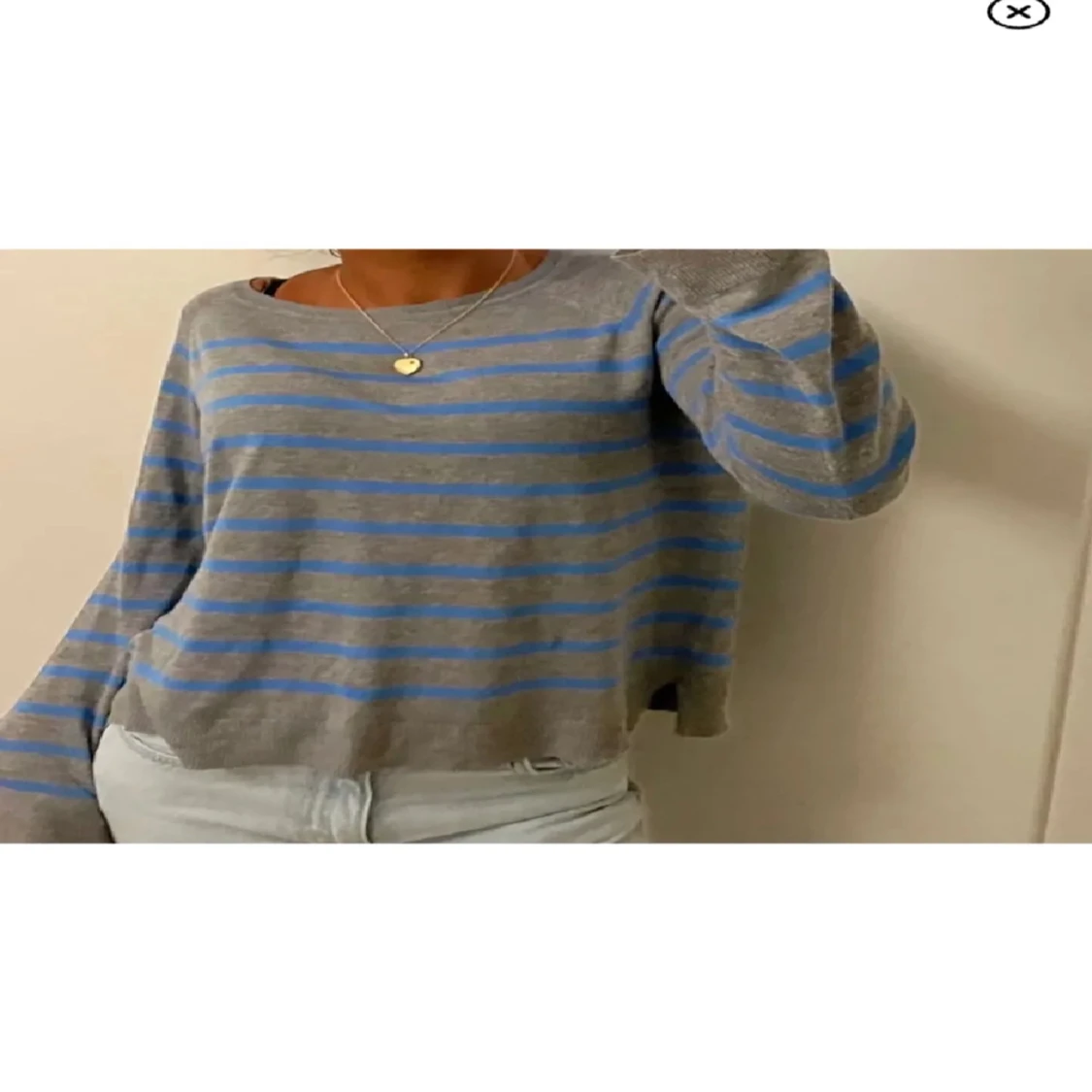 Säljer en stilren grå tröja med blå ränder. Tröjan har långa ärmar och en avslappnad passform, perfekt för en casual look. Den är tillverkad i ett mjukt material som känns skönt mot huden.