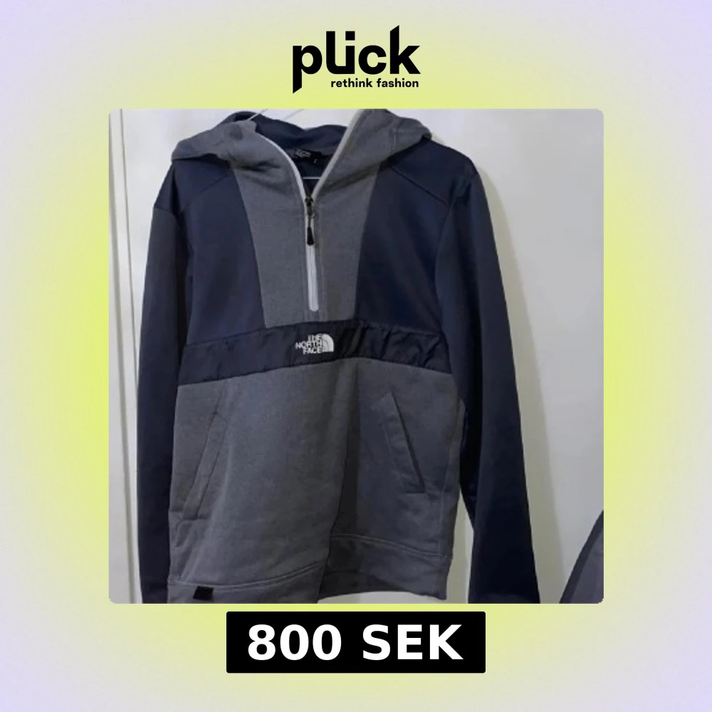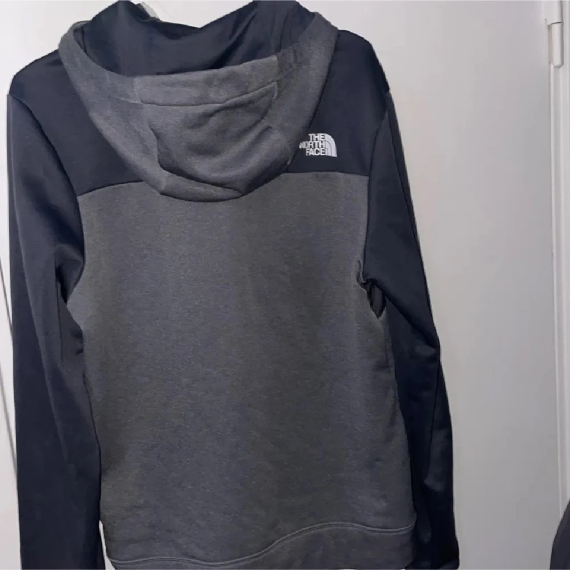 Säljer en snygg hoodie från The North Face i grått och mörkblått med halv dragkedja och huva. Tröjan har logga på bröstet och ryggen, praktiska fickor och långärmade ärmar. Perfekt för chill eller träning, riktigt skön och stilren design.