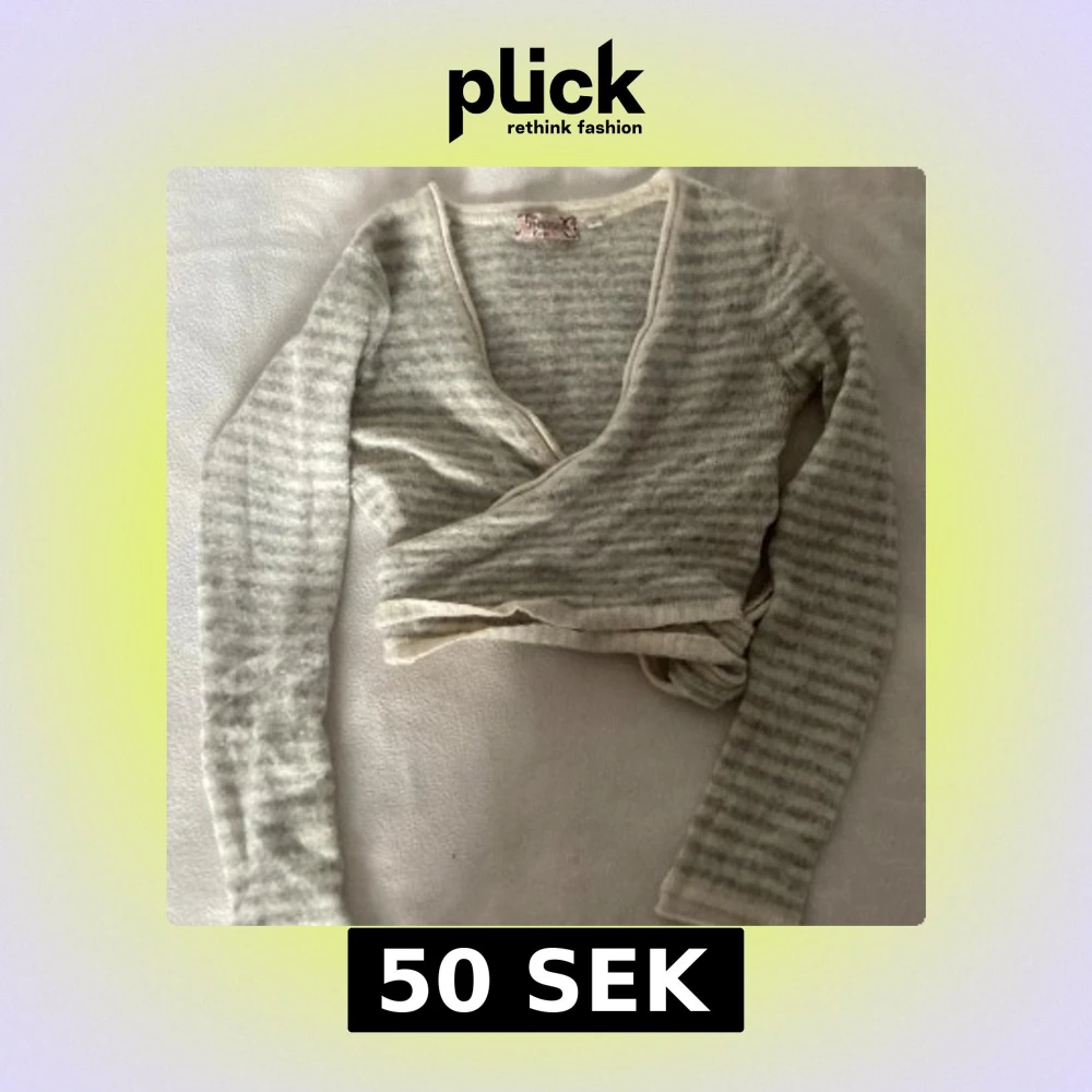 Säljer en mysig grå och vit randig omlottopp från Indiska. Toppen har långa ärmar och knytband framtill för en justerbar passform. Perfekt för en avslappnad stil.