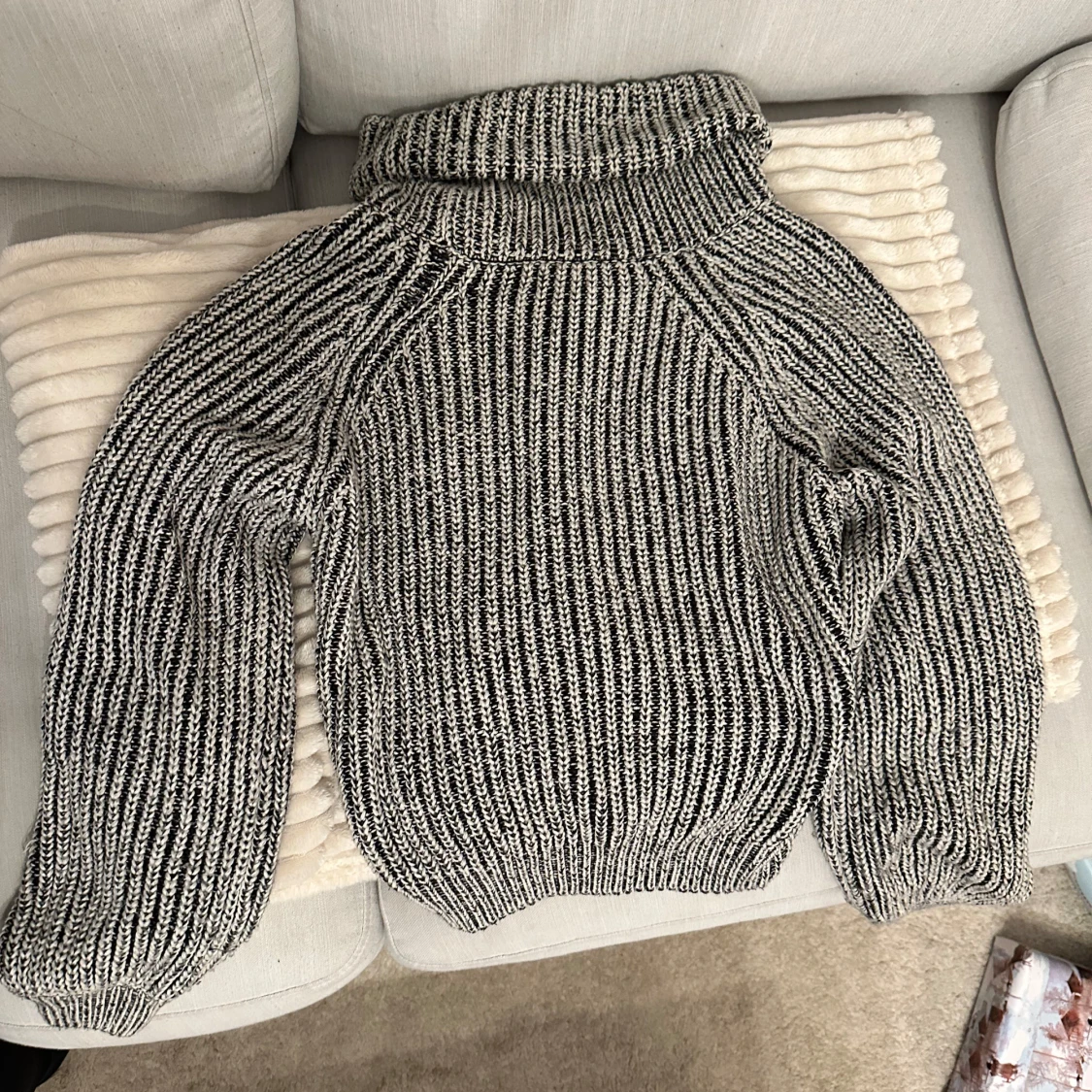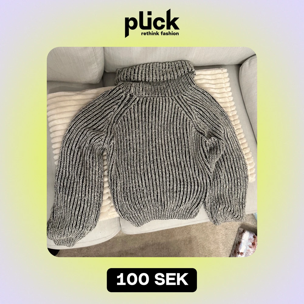 Mysig grå och vit stickad polotröja med ribbat mönster från bikbok. Perfekt för kyliga dagar med sin höga krage och långa ärmar. Tröjan har en avslappnad passform och är idealisk för både höst och vinter.