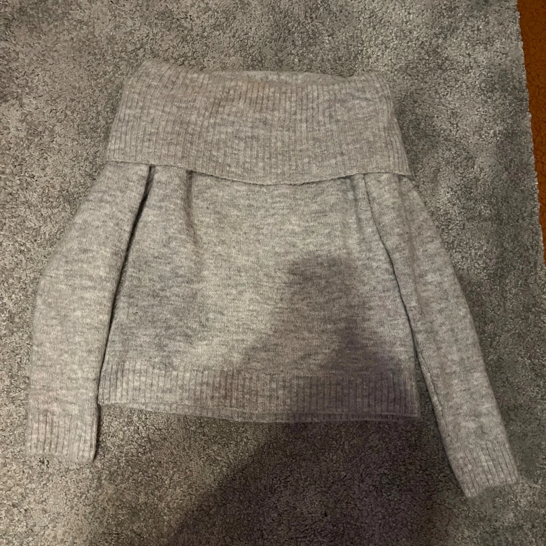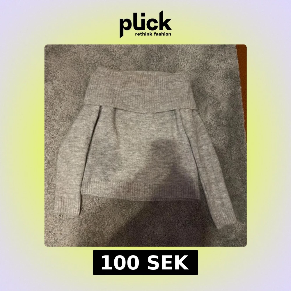 Supermysig grå stickad tröja med bred offshoulder-krage och långa ärmar. Perfekt för kyliga dagar när du vill vara både varm och snygg. Ribbstickade detaljer vid krage, ärmslut och nederkant ger en extra touch.