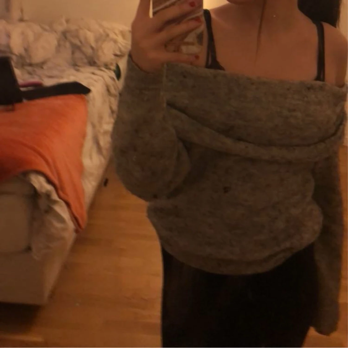 Mysig grå offshoulder tröja med lång ärm och ribbade detaljer. Perfekt för en avslappnad stil.