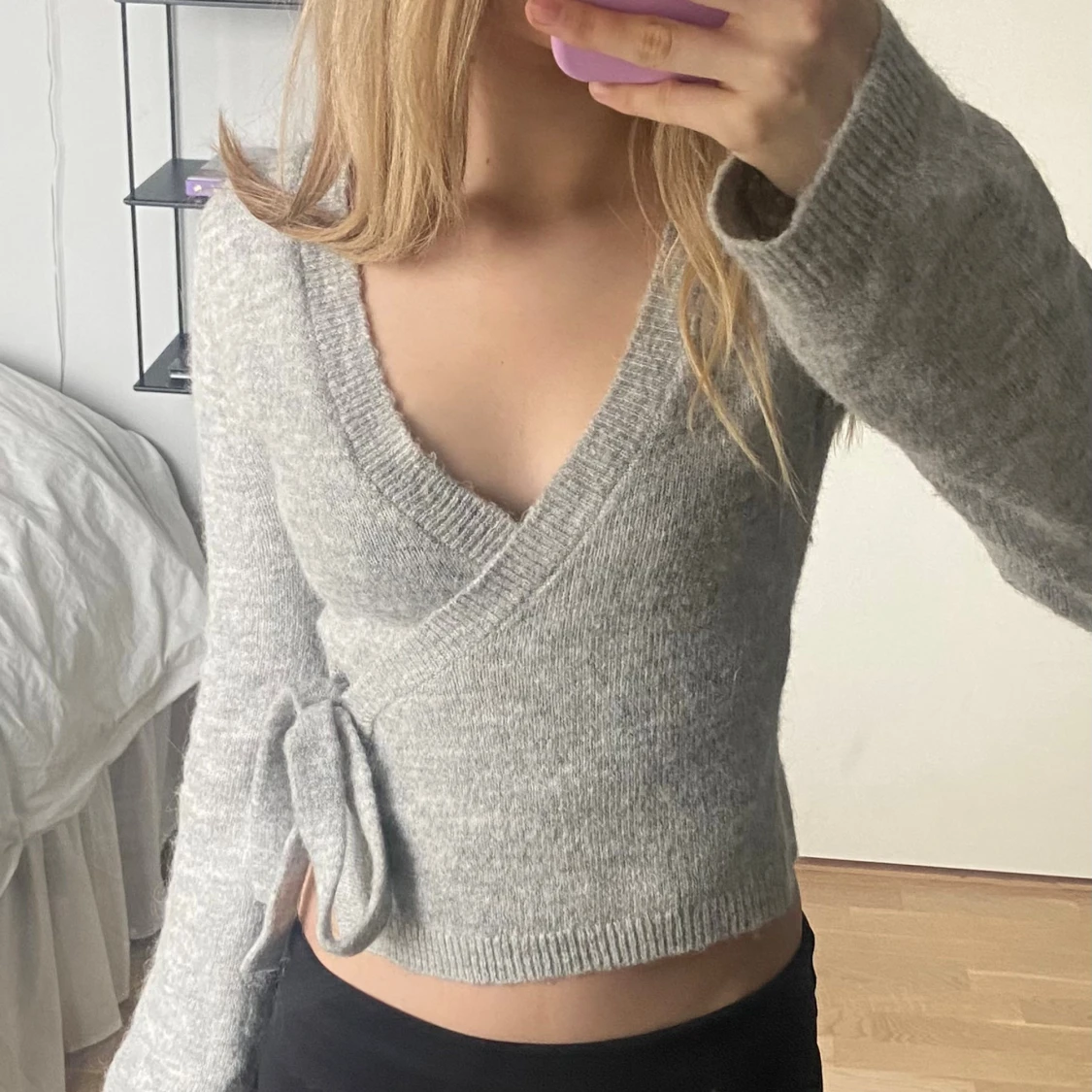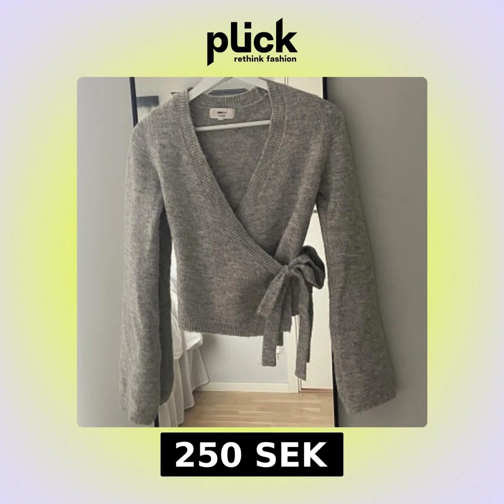 Supermysig grå stickad omlottkofta från Gina Tricot med knyt i sidan & v-ringad hals. Koftan har lång ärm & ribbade kanter, perfekt för höst & vinter 💗