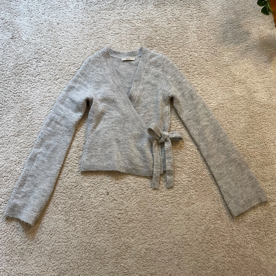 Supermysig grå omlottkofta från Gina Tricot i stickad kvalitet. Koftan har långa ärmar, v-ringning och knyt i sidan för en snygg passform. Knappt använd. Nypris: 400kr. Storlek: xs. Skriv privat om frågor 💕