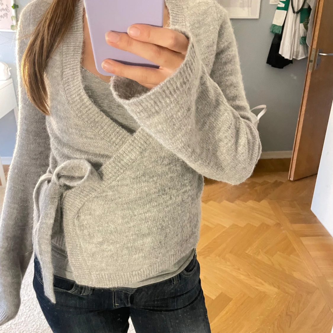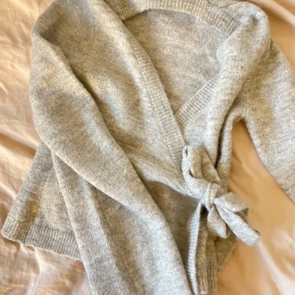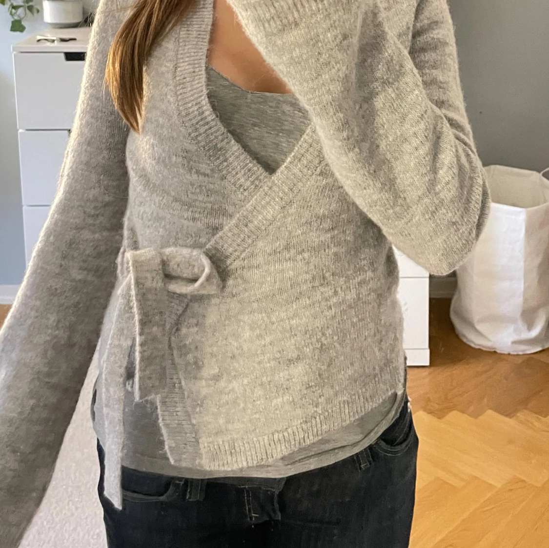 Mysig grå omlottkofta från Gina Tricot i ullblandning. Koftan har långa ärmar, v-ringad hals och knyt i sidan som ger en snygg passform. Perfekt att slänga på sig när det är lite kyligt ute. Stilren och enkel att matcha med jeans eller kjol.