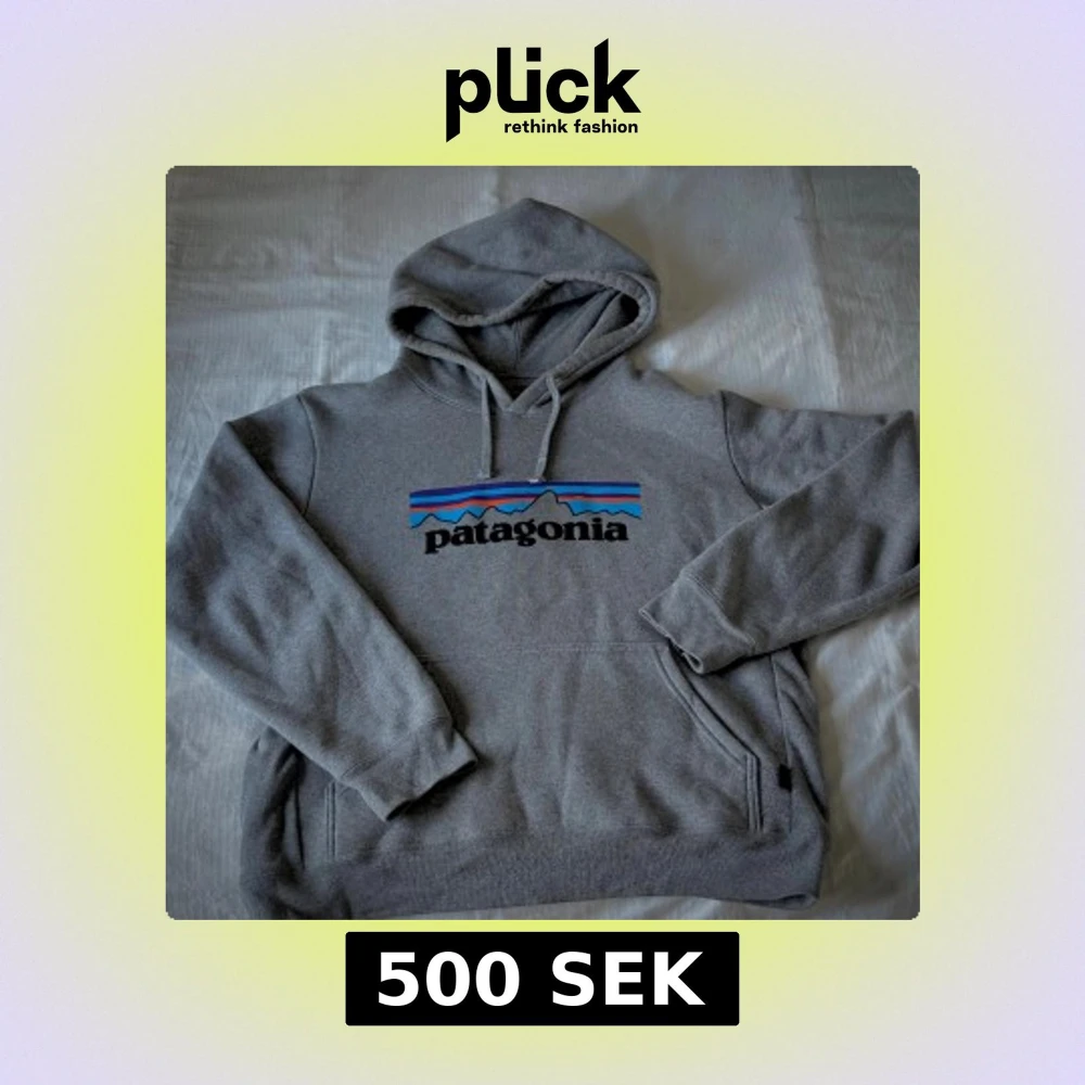 Säljer en grå hoodie från Patagonia med klassiskt logotryck.