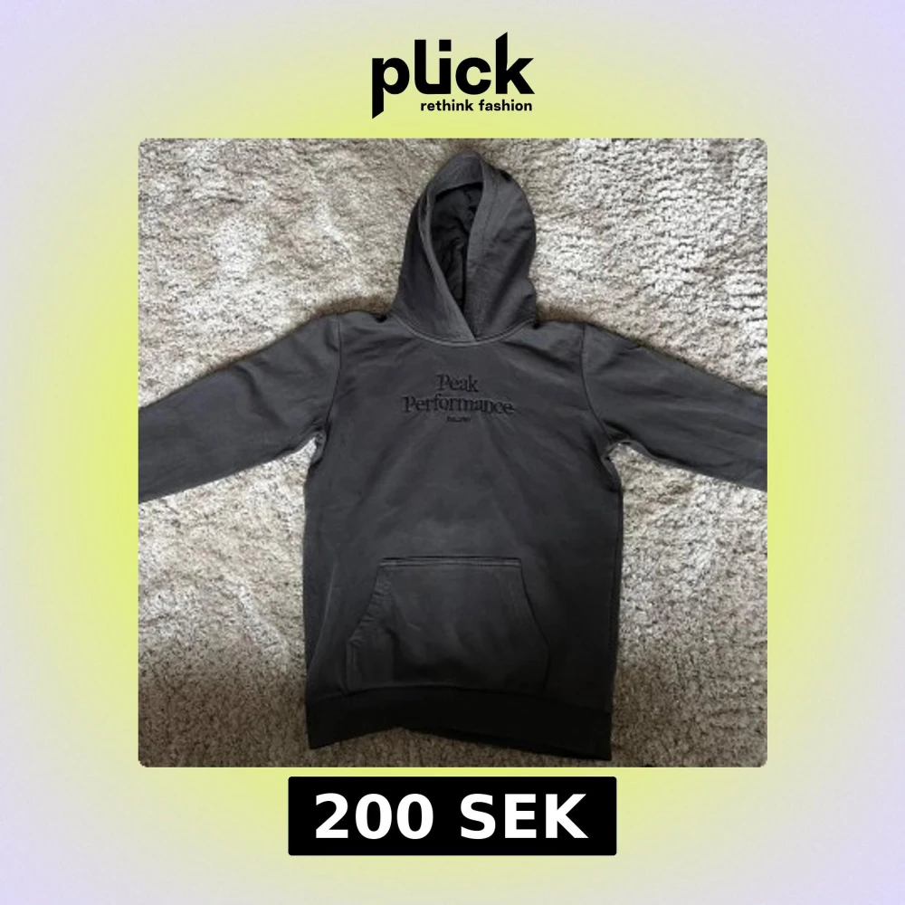 Säljer en mörkgrå hoodie från Peak Performance med broderad logga på bröstet. Tröjan har huva och en stor magficka framtill. Perfekt för en avslappnad och sportig stil.