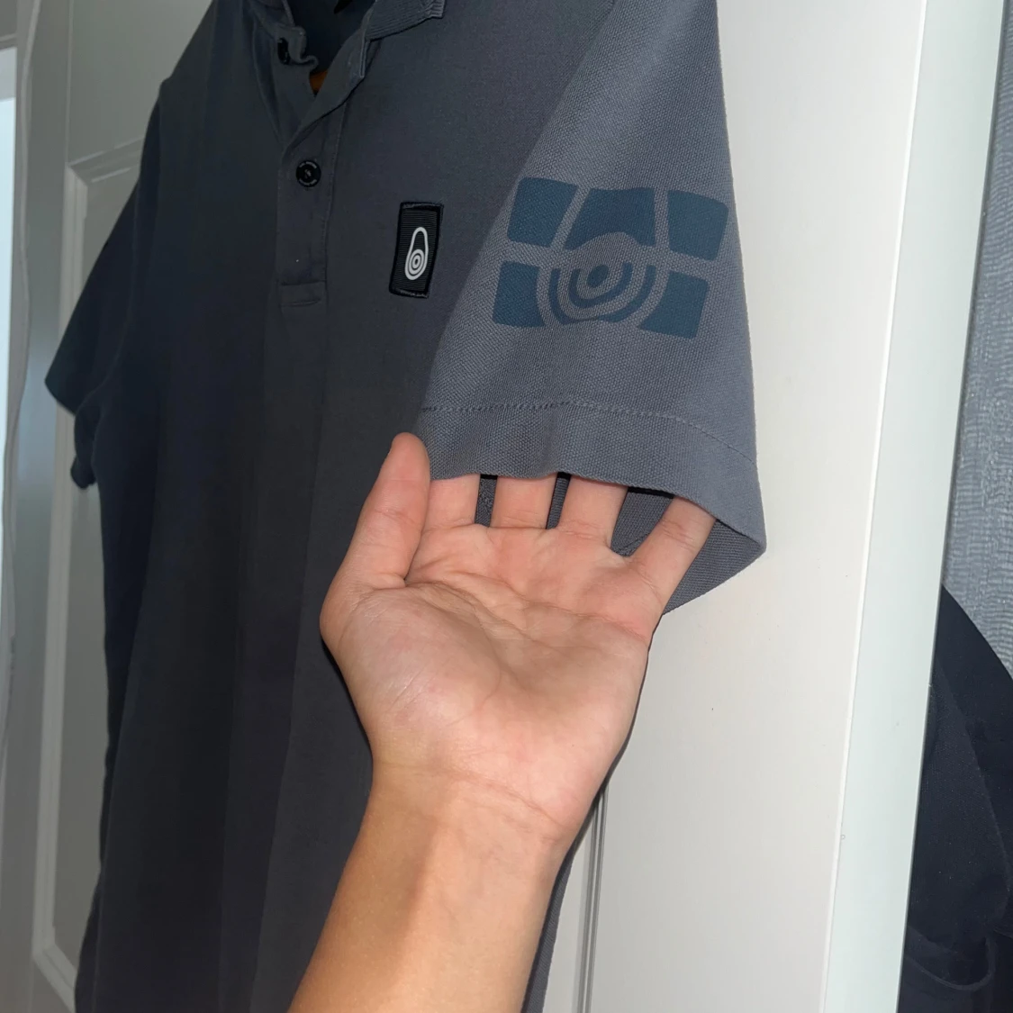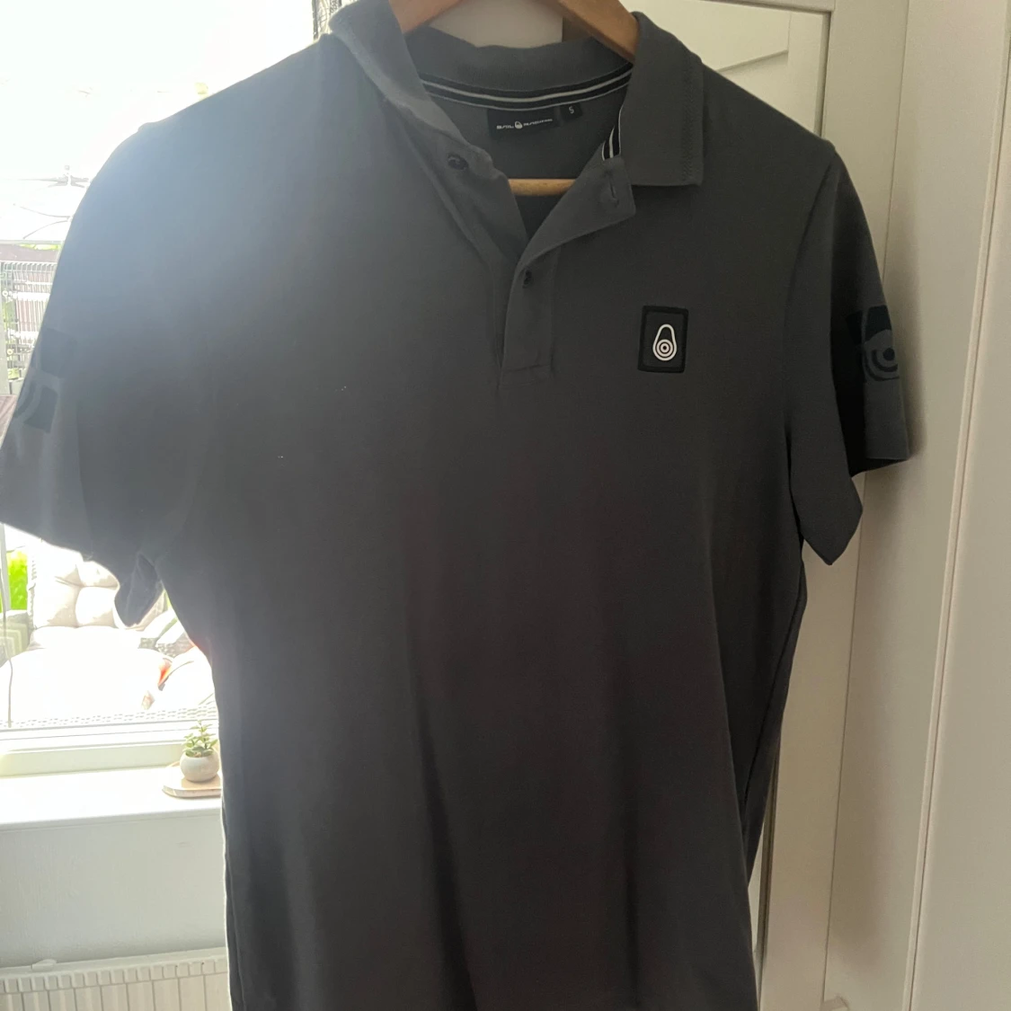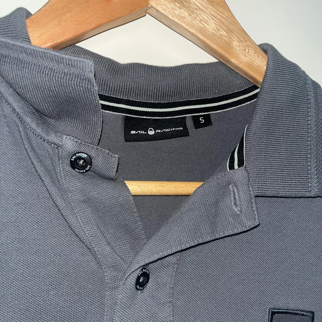 Säljer en snygg grå pikétröja från Sail Racing i storlek S. Tröjan har korta ärmar och en klassisk krage med knappar. Den är perfekt för både vardag och fritid. Tröjan har en liten logga på bröstet och ett tryck på ärmen😁