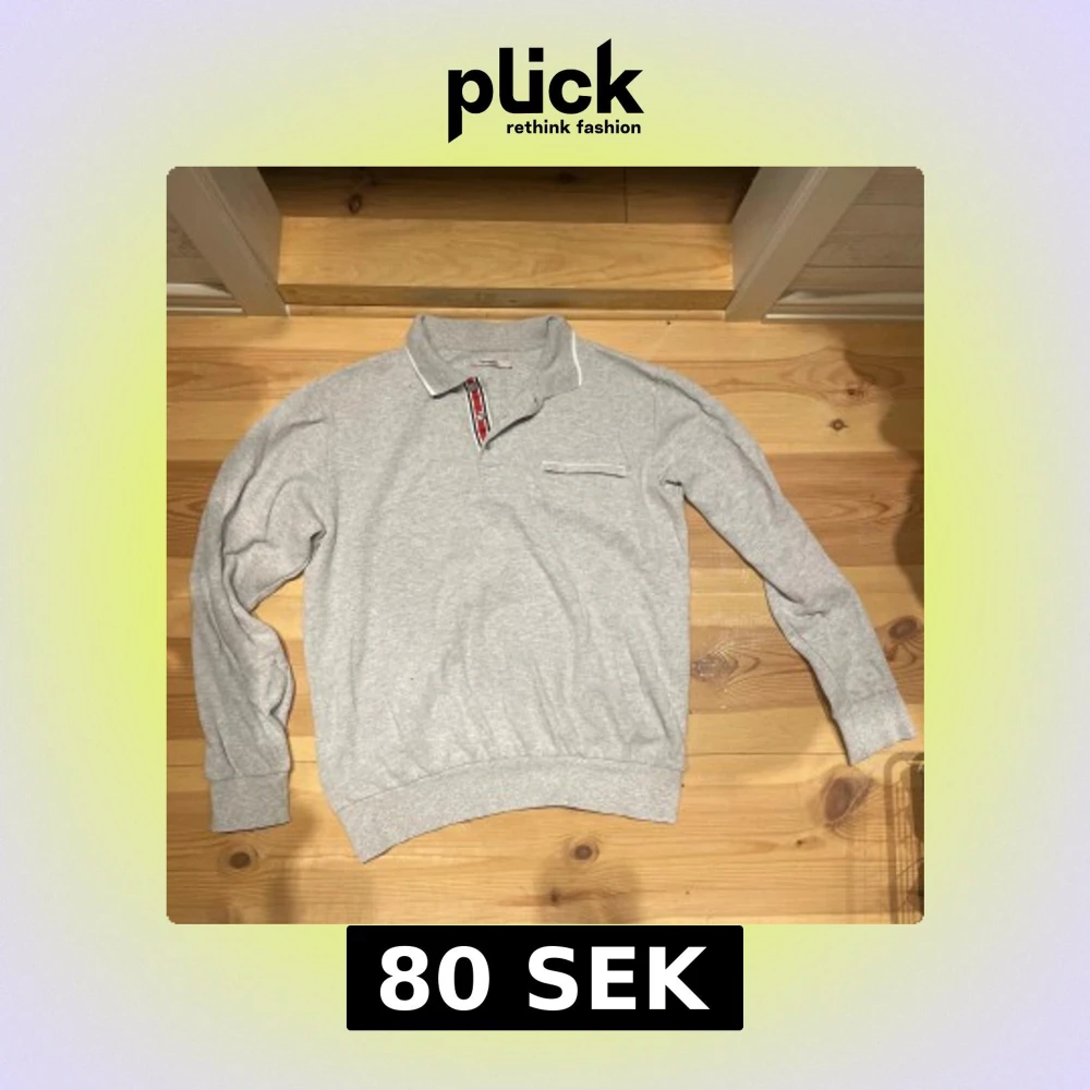 Snygg grå långärmad pikétröja med klassisk krage och vit kant. Tröjan har en liten bröstficka och detaljer vid knäppningen i rött och svart. Perfekt för en chill och stilren look.