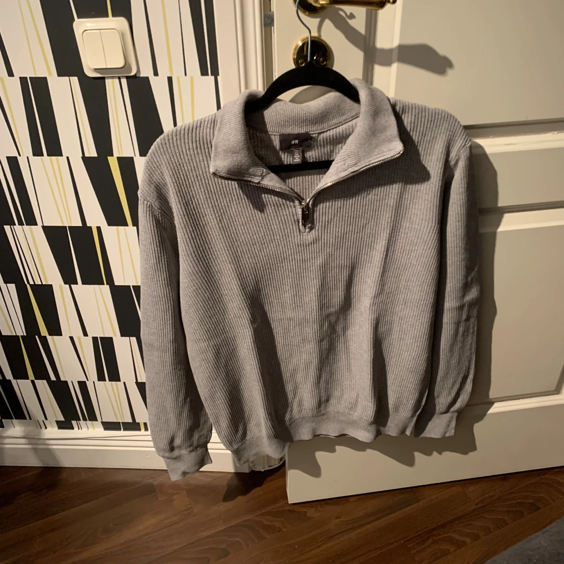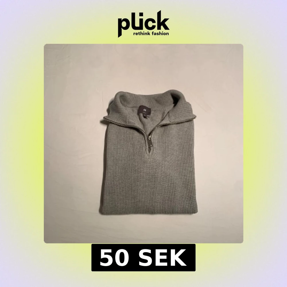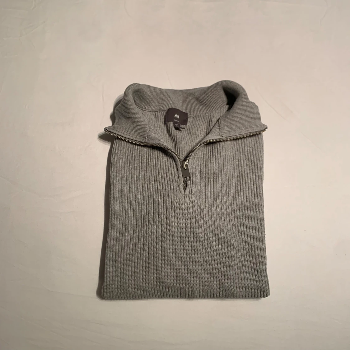 Säljer en grå ribbstickad tröja från H&M med half zip-dragkedja och hög krage. Slim fit-modell med långa ärmar och mjukt material som passar perfekt till lager-på-lager. Enkel och stilren design som funkar till det mesta.