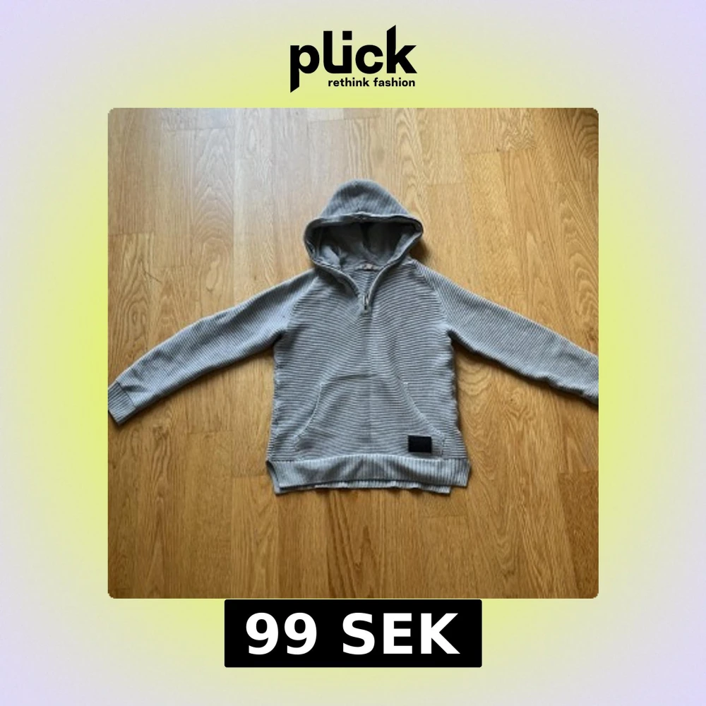 Säljer en grå ribbad hoodie från H&M i storlek 146/152. Tröjan har huva, half zip och en känguruficka framtill. Materialet är mjukt och stickat, perfekt för chill dagar. Långärmad och med snygga detaljer i ribbad struktur.