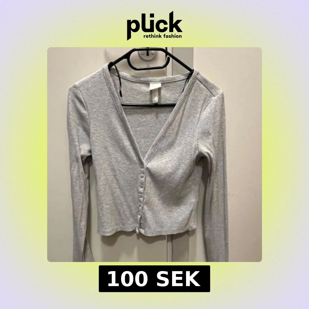 Säljer en stilren grå ribbad kofta med v-ringning och knappar framtill. Nästan aldrig använd så tröjan är i fint skick
