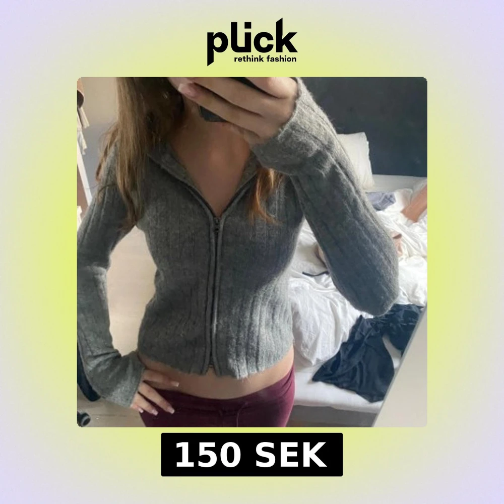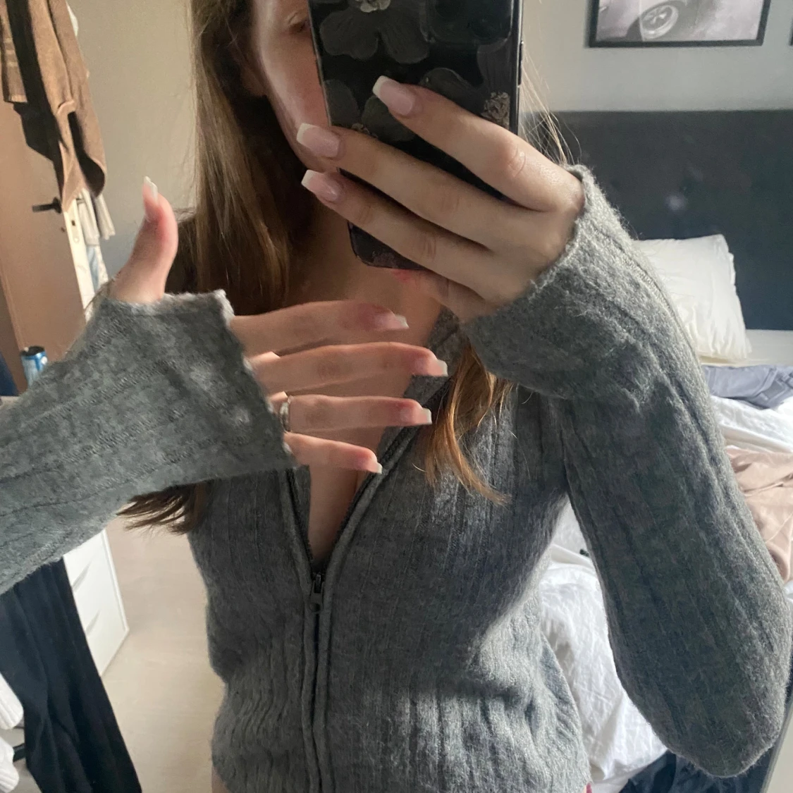 Säljer en grå ribbstickad kofta med dragkedja framtill. Modellen är figurnära med långa ärmar och mjukt material. Jättemysig nu till kallare dagar