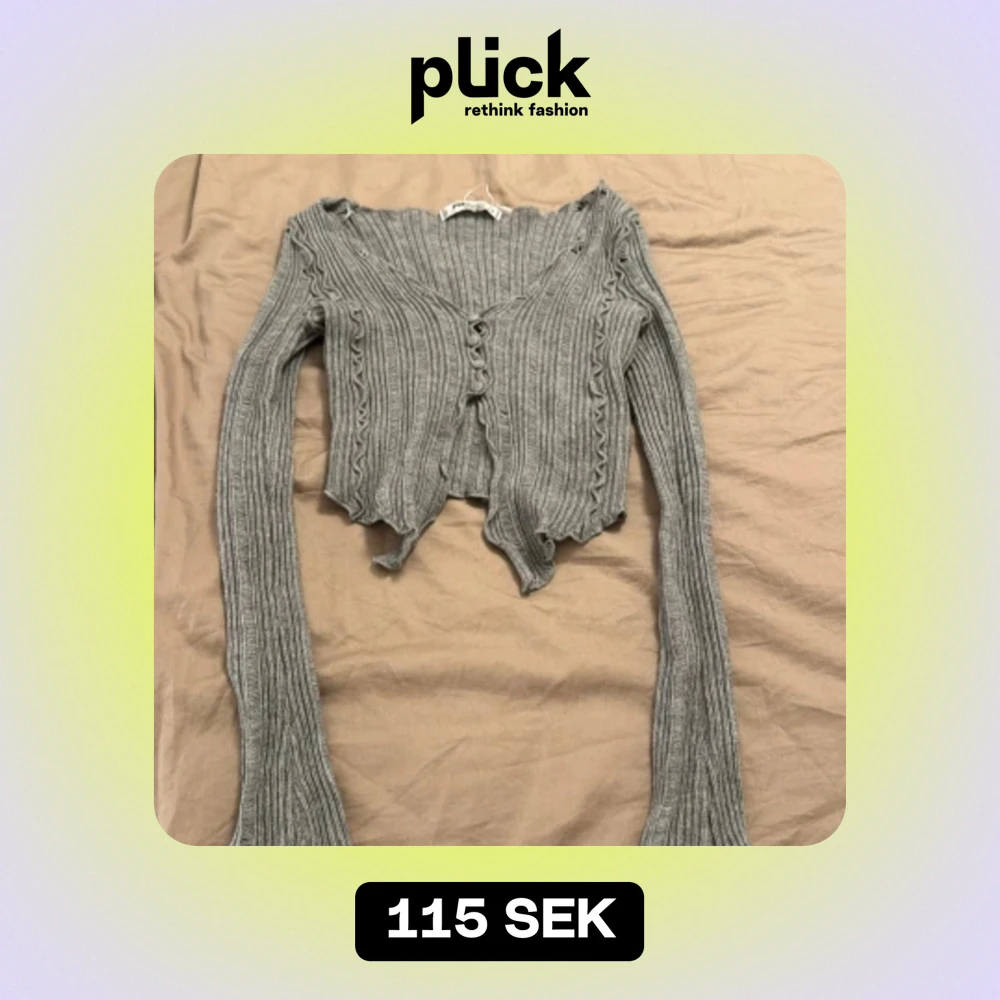 En grå ribbad kofta med långa ärmar och knappar framtill. Koftan har en vågig kant vid ärmslut och nederkant, vilket ger den en unik och stilfull look.